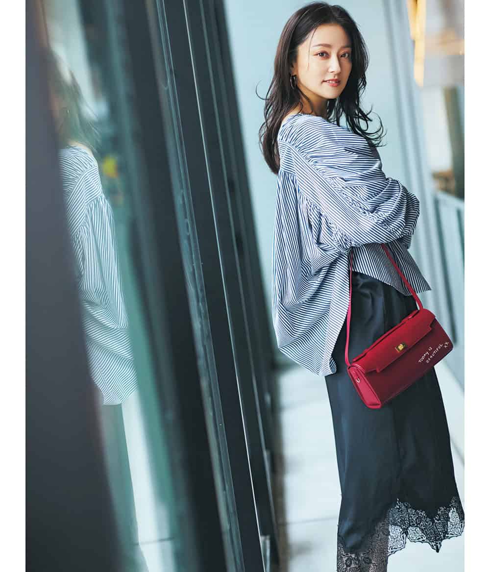 ストライプブラウス¥29,700(プルミエ アロンディスモン)スカート¥29,920(アストラット/エディット ユナイテッドアローズ梅田店)バッグ¥253,000(アニヤ ハインドマーチ/ロンハーマン)ピアス¥42,900(ete bijoux)