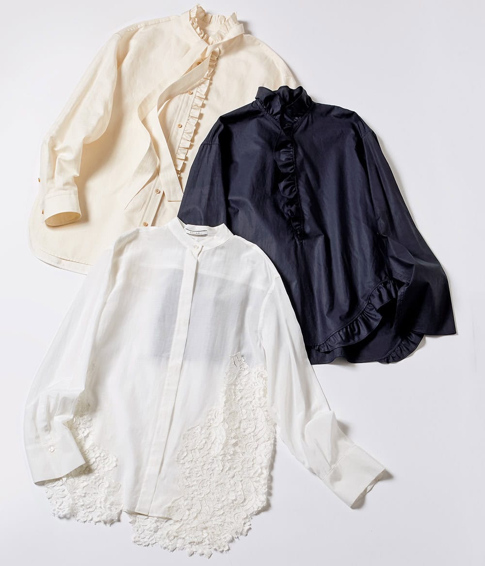 <上>ボウタイフリルシャツ¥39,600 (デパリエ 伊勢丹新宿店)<中>ネイビーフリルシャツ¥33,000(ロエフ/エイチ ビューティー&ユース)<下>レースブラウス¥48,400(ベイジ,/オンワード樫山 お客様相談室)
