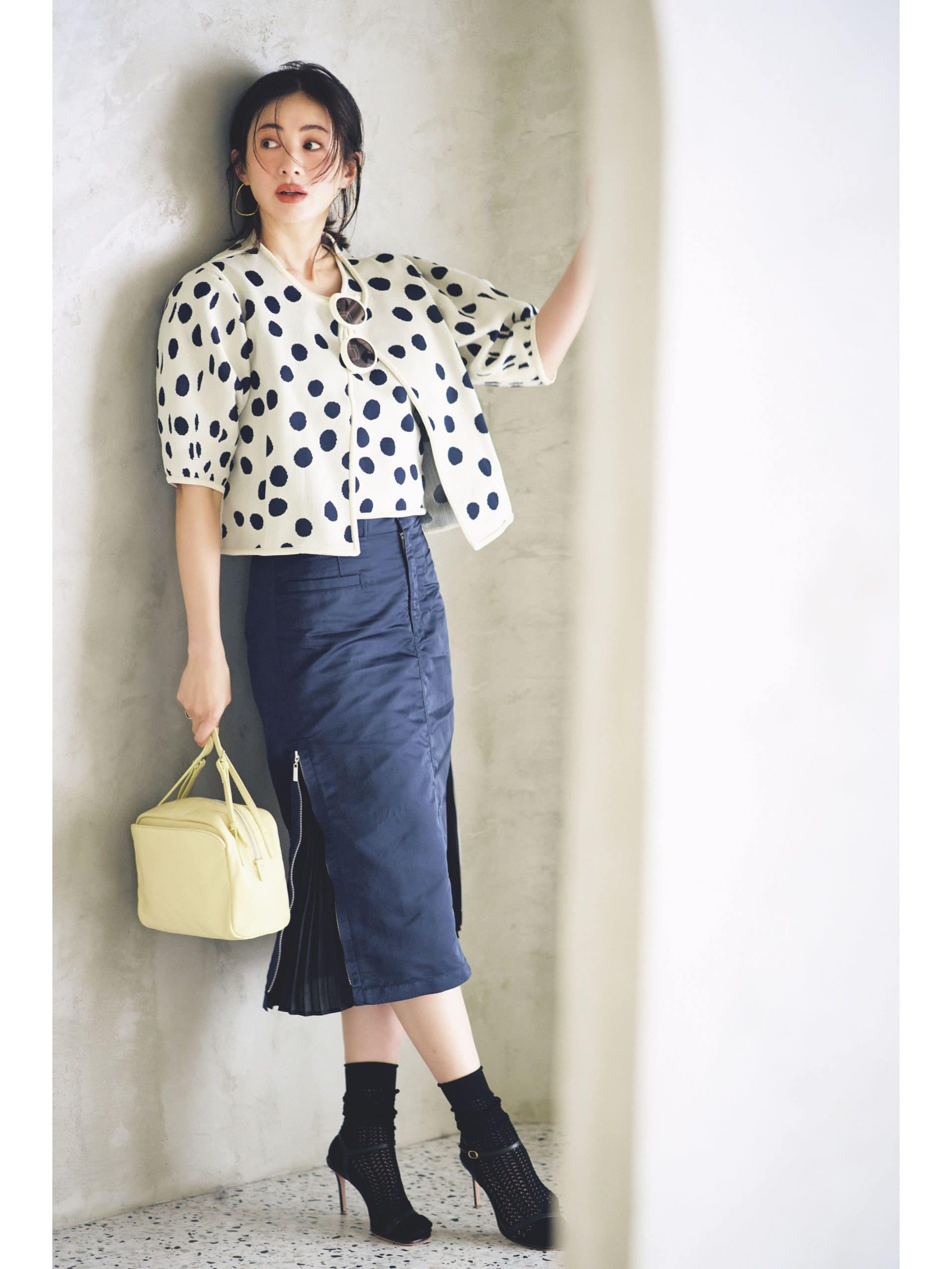 スカート¥26,400(ソフィット/ソフィット 新宿店) ジャケット(4月発売)¥132,000インナー(4月発売)¥91,300 (ともにペパポンボ/ロンハーマン)バッグ¥33,000(ラシット/ラシット 京王百貨店新宿店)サンダル¥79,200(ペリーコ/アマン)ソックス¥3,630(コンリード/トゥモローランド)ピアス¥39,600〈バージュエリー〉(エルディスト ショールーム)サングラス¥48,400(プロポ/プロポデザイン)