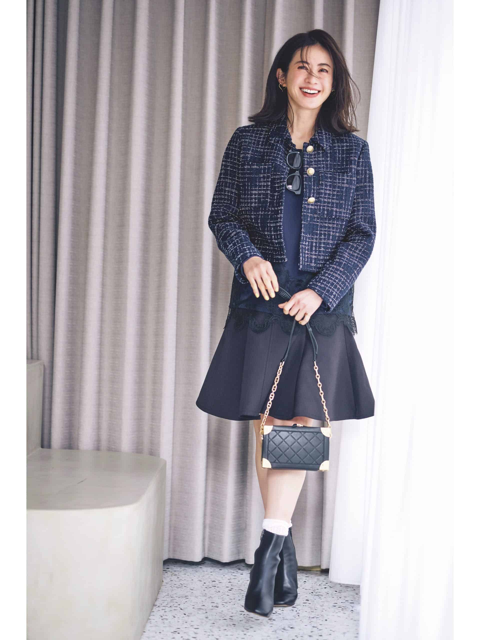40代のミニスカは、大人な落ち着きが漂う膝丈がおすすめ。脚を見せながらも、太ももやお尻周りなど気になる部分はしっかりとカバーできます。丈感に加え、Aラインの形なら女性らしいビジュアルに仕上がるのもポイントです。