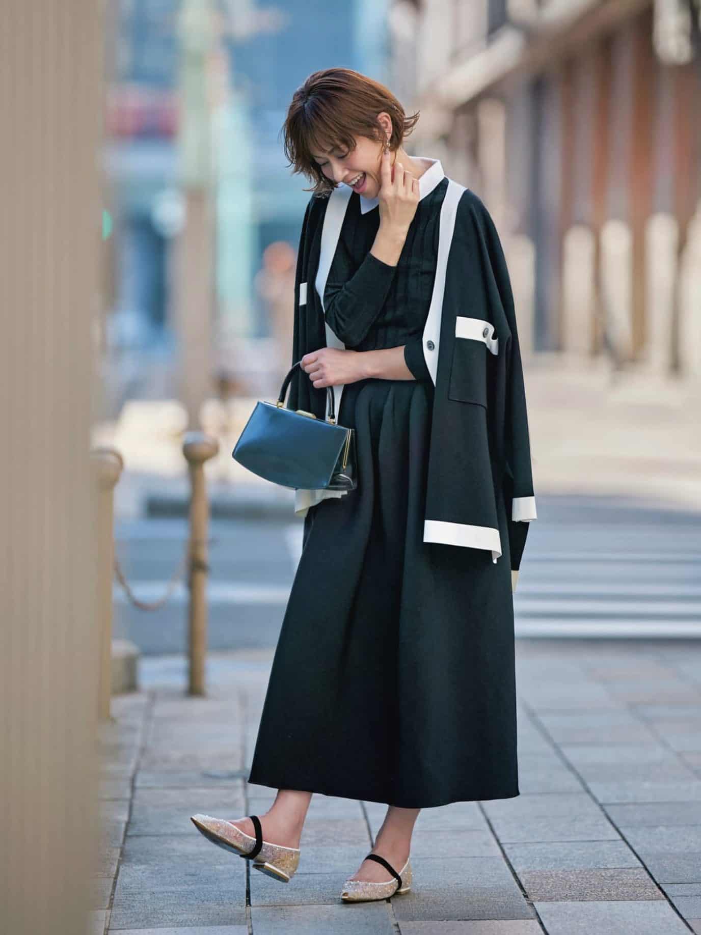 長すぎず短すぎない程良い丈感が魅力的なミモレ丈。絶妙な丈感だけに、バランス作りが「キレイ見え」のカギ。ヒールでぐいっと重心を上に上げることで、足長効果が狙えます!