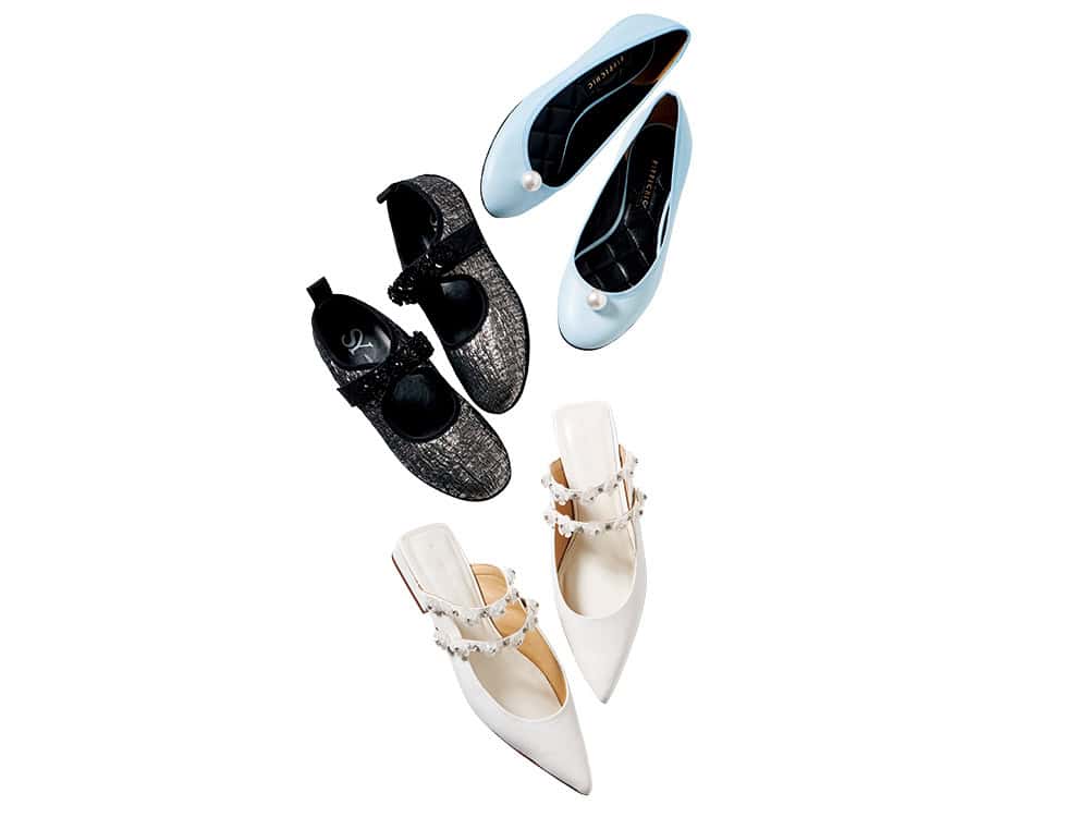 <上>パール付きシューズ¥41,800(ピッピシック/ベイジュ)<中>シルバーシューズ¥13,970(シー ユナイテッドアローズ/ユナイテッドアローズ カスタマーサービスデスク)<下>お花付きシューズ¥36,300(ツル バイ マリコ オイカワ)