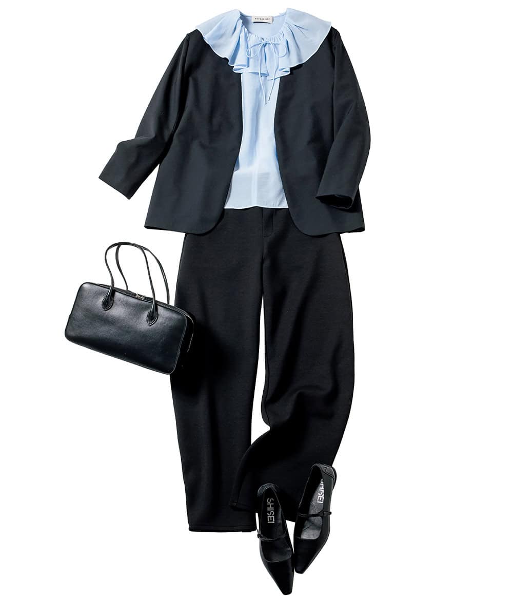 ジャケット¥75,900(エイトン青山)ブラウス¥33,000(デパリエ伊勢丹新宿店)パンツ¥24,200(アルページュ ストーリー)バッグ¥86,900(メゾンカナウ/ヤマニ)シューズ¥36,300(シーセイ/アイネックス)