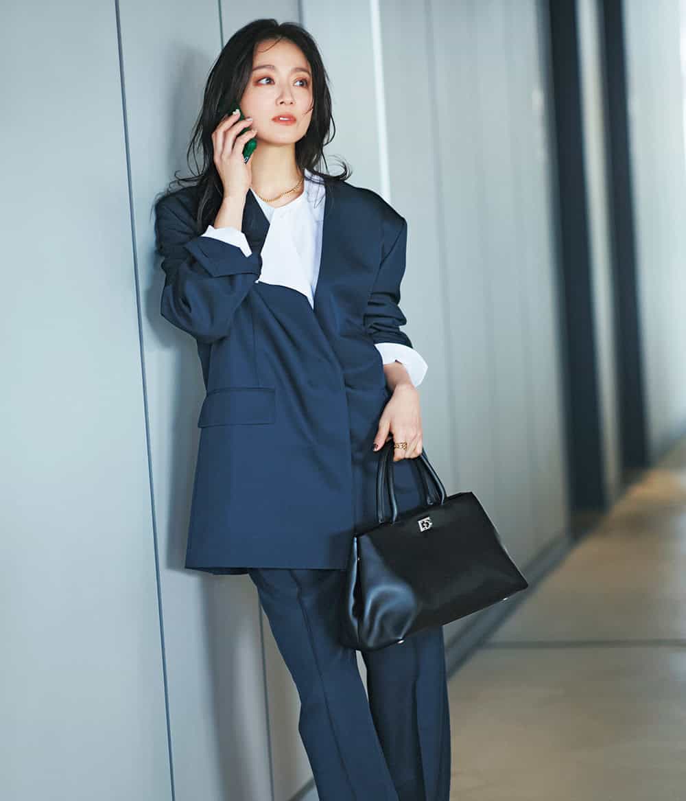 ネイビージャケット¥56,100ブラウス¥39,600パンツ¥34,100(すべてエブール/リトルリーグ インク)バッグ¥19,800 (ドゥーブル/サロン アダム エ ロペ)ネックレス¥104,500リング¥37,400(ともにエンド カスタム ジュエラーズ×ハイク/ボウルズ)