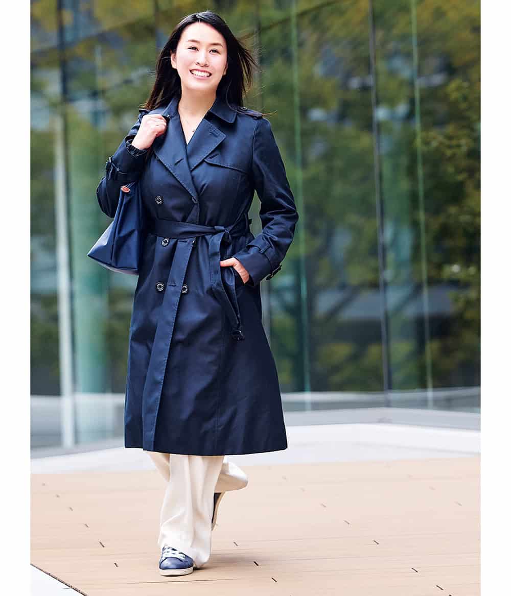 いよいよ子どもたちが巣立っていくことを実感した45歳の時、オフィスの総合受付として週3のパート勤務を開始。病院事務を経て、昨年から前職と同じ職種の広告代理店での勤務が叶いました。社長が「主婦歴が長い人は、家族のフォローに尽力してきた分、献身的でコミュ力が高い」と言ってくれて。社訓に「服装は迷ったら黒より清潔感のある紺」とあり、母ネイビーが復活。初めてのスニーカー通勤など、オフィスカジュアルを楽しんでいます。