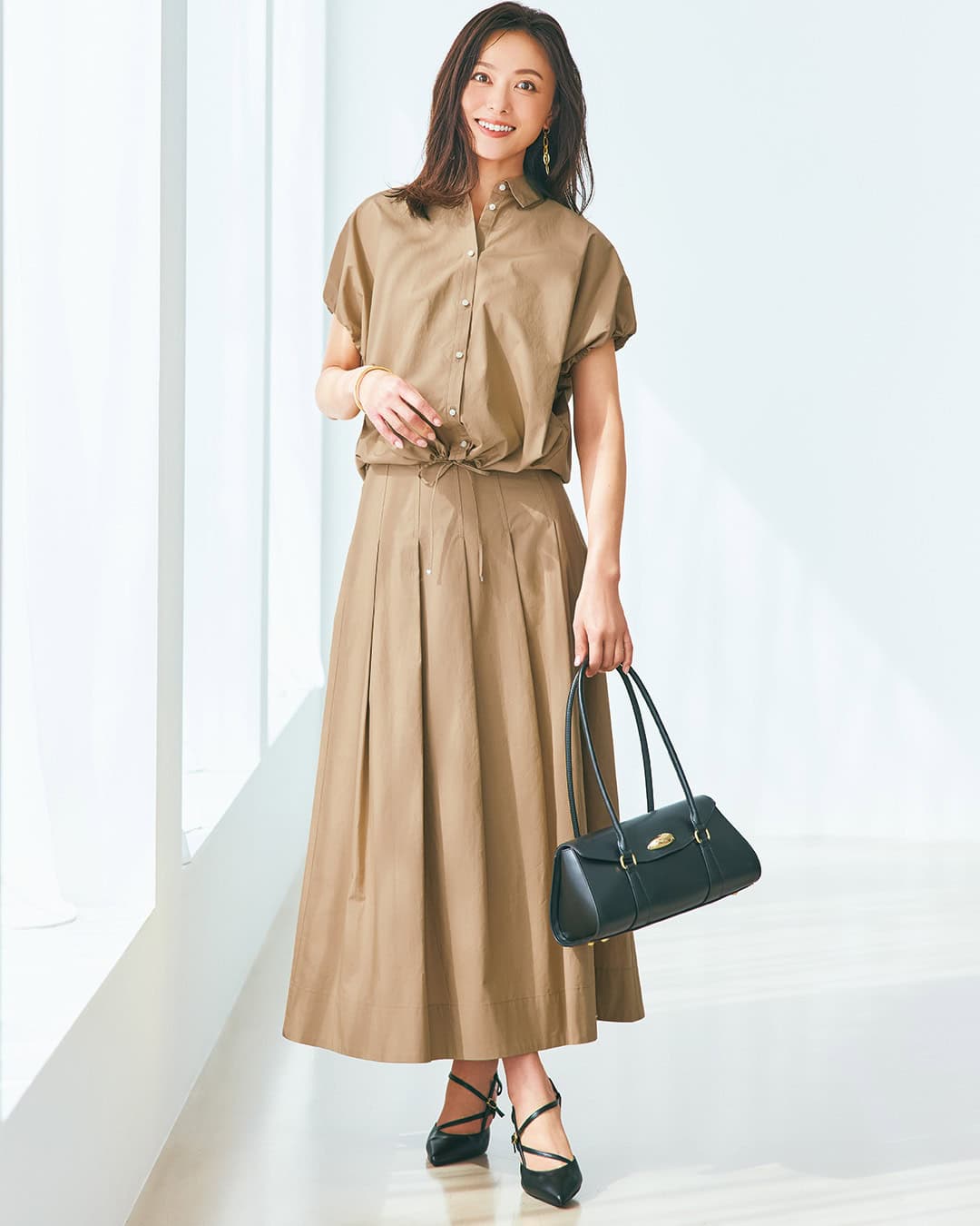 ブラウス¥14,960スカート¥19,800(ともにDAY by DAY it’s international)バッグ¥16,500パンプス¥19,800(ともにダイアナ/ダイアナ 銀座本店)ピアス¥12,100バングル¥22,000(ともにワンエーアールバイウノアエレ/ウノアエレ ジャパン)