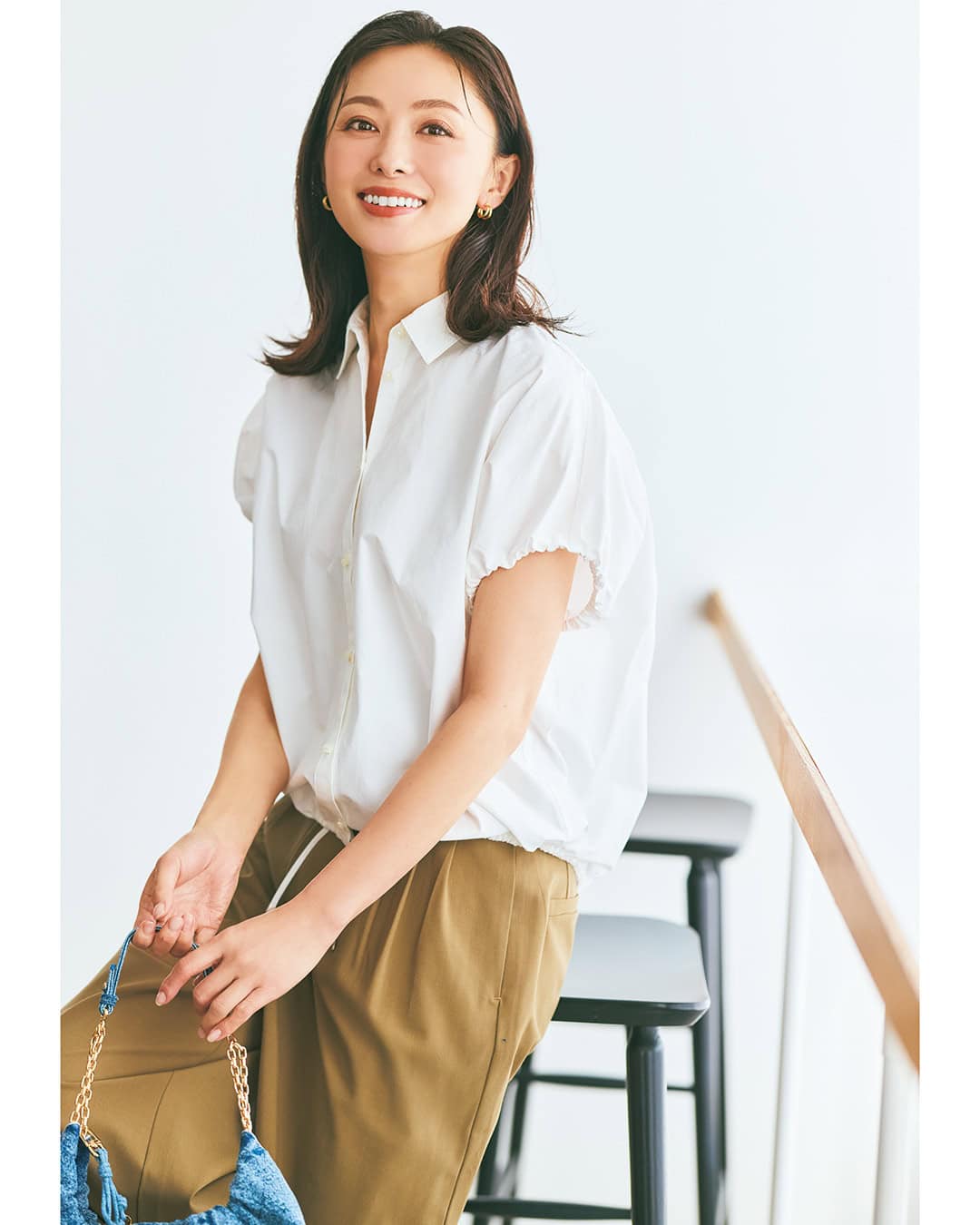 ブラウス¥14,960(DAY by DAY it’s international)パンツ¥22,000(メゾンスペシャル/メゾンスペシャル 青山店)バッグ¥13,900(チャールズ&キース/チャールズ&キース ジャパン)ピアス¥137,500(ウノアエレ/ウノアエレ ジャパン)