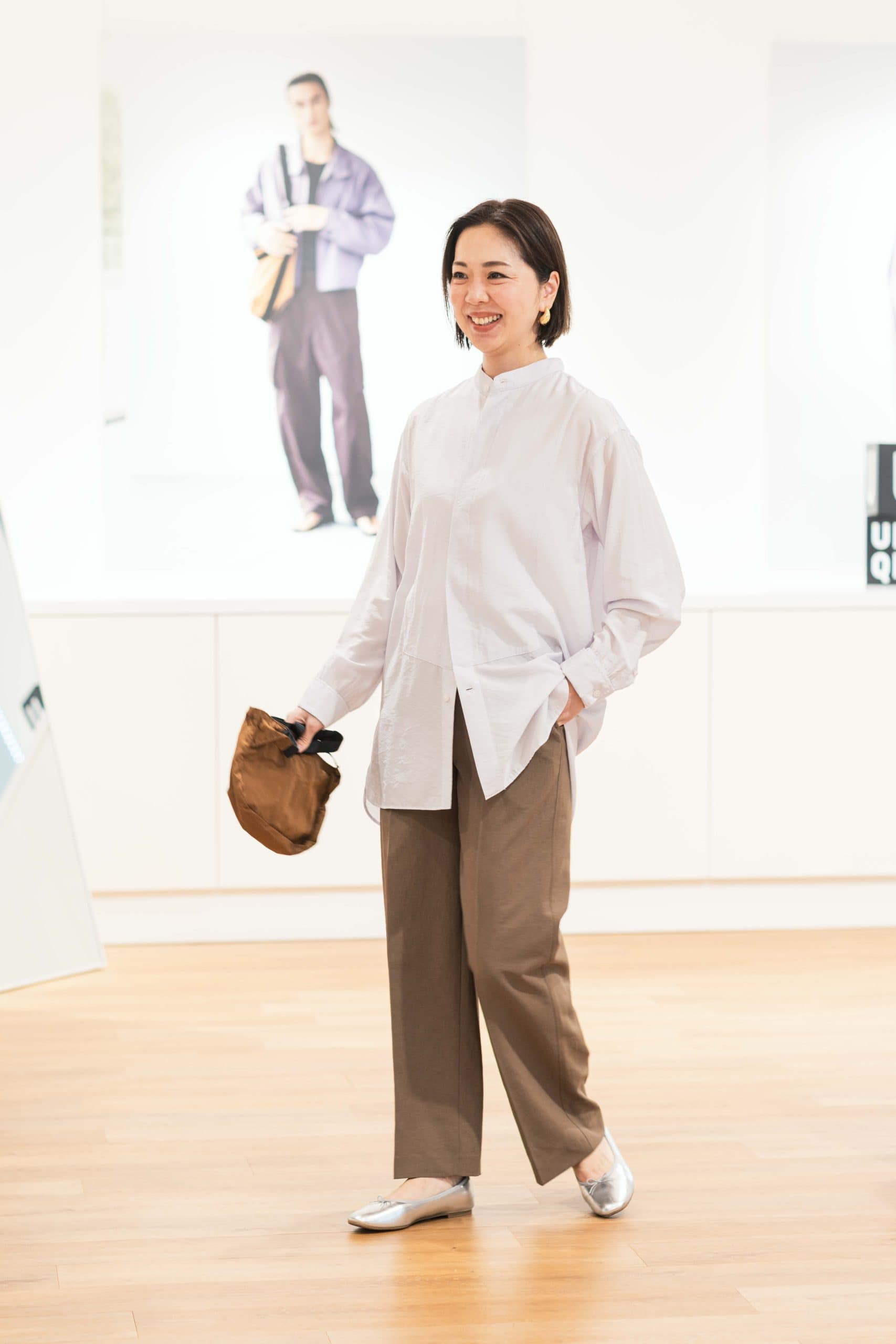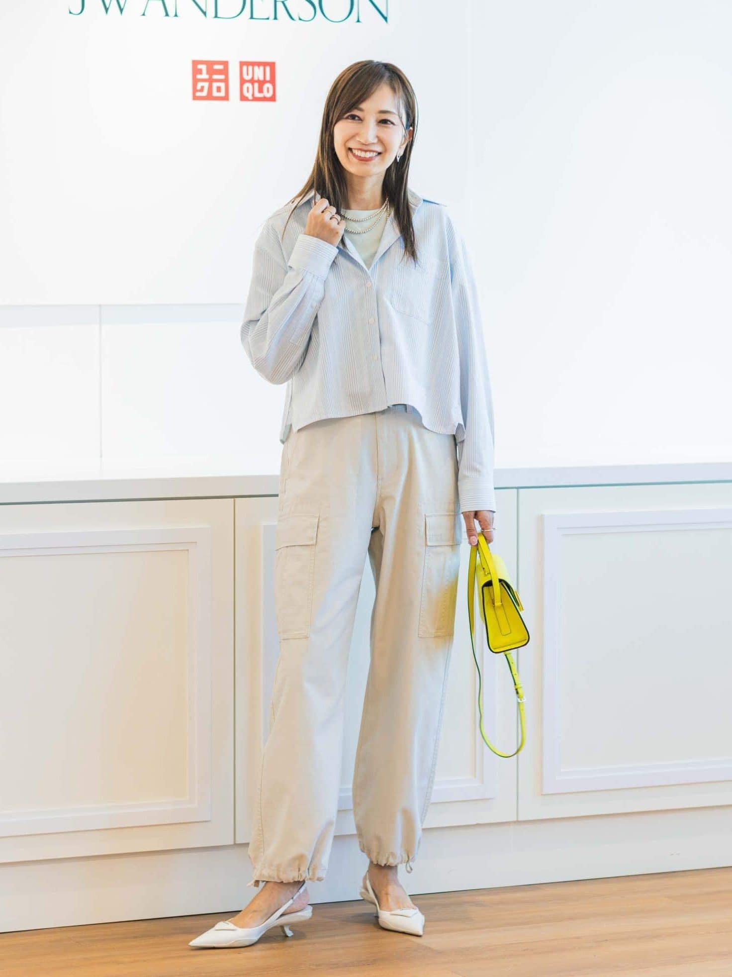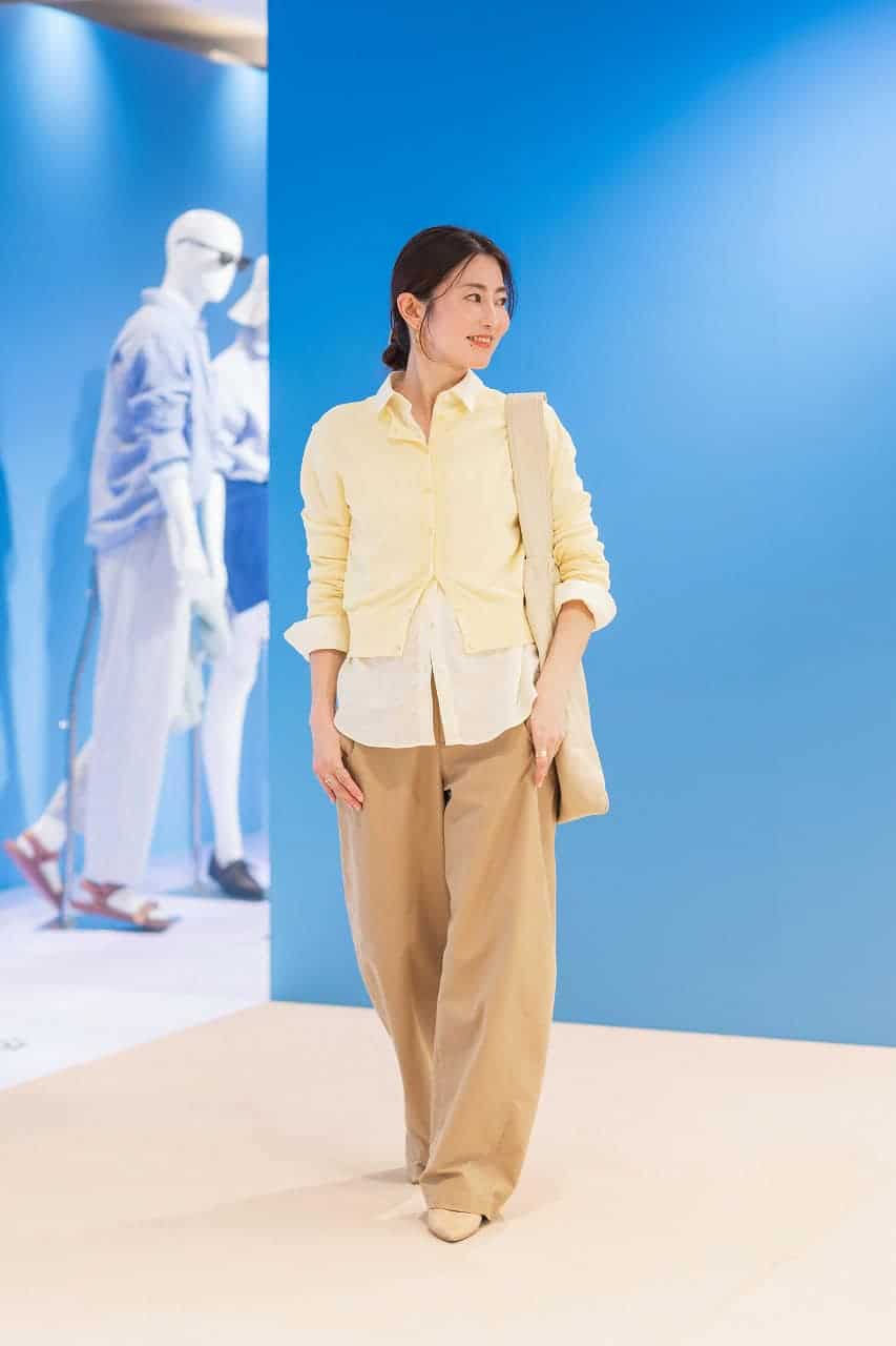 「私が手に取ったのはイエローが春らしいこちらのカーディガン。同色のリネンシャツを重ねてグラデーションコーデにして、鮮度高めのおしゃれを楽しみたいです。バレルレッグシルエットのワイドパンツはベージュをチョイス。小物もベージュ系で統一し、イエローが活きる柔らかトーンでまとめました」