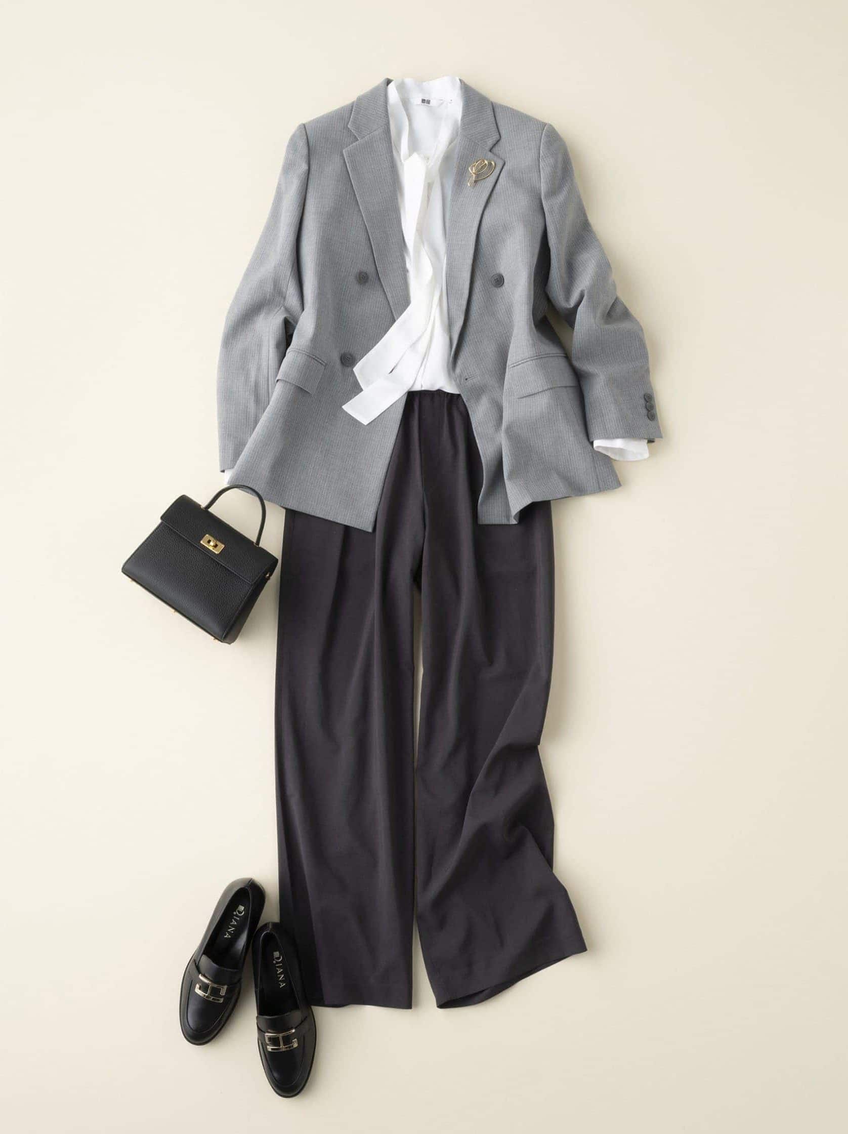 ジャケット¥6,990 ブラウス¥ 2,990パンツ ¥3,990(すべてユニクロ) バッグ¥209,000(ミチノ・パリ/アマン) ローファー¥18,150(ダイアナ/ダイアナ 銀座本店) ブローチ¥2,990(プラステ)