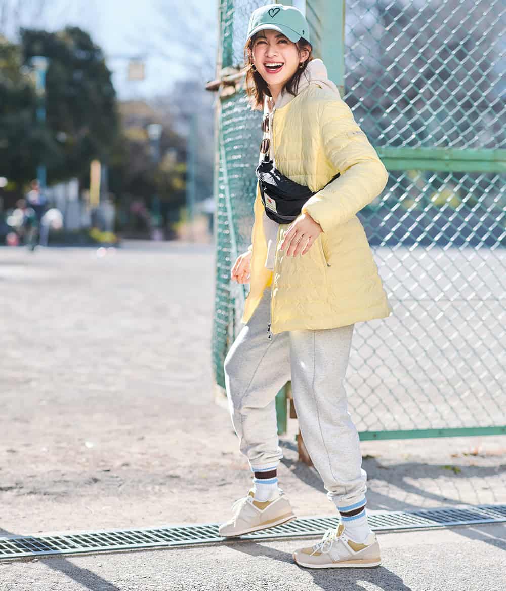 コート※ベルト付き¥121,000(タトラス/タトラス カスタマーセンター)パーカ¥7,150パンツ¥6,820バッグ¥2,970ソックス¥1,320(すべてフルーツオブザルーム/ギャレット)スニーカー¥14,960(ニューバランス/ニューバランス お客様相談室)キャップ¥4,400(フォーティーセブン)サングラス¥45,100(プロポ/プロポデザイン)ピアス¥39,600(リューク)