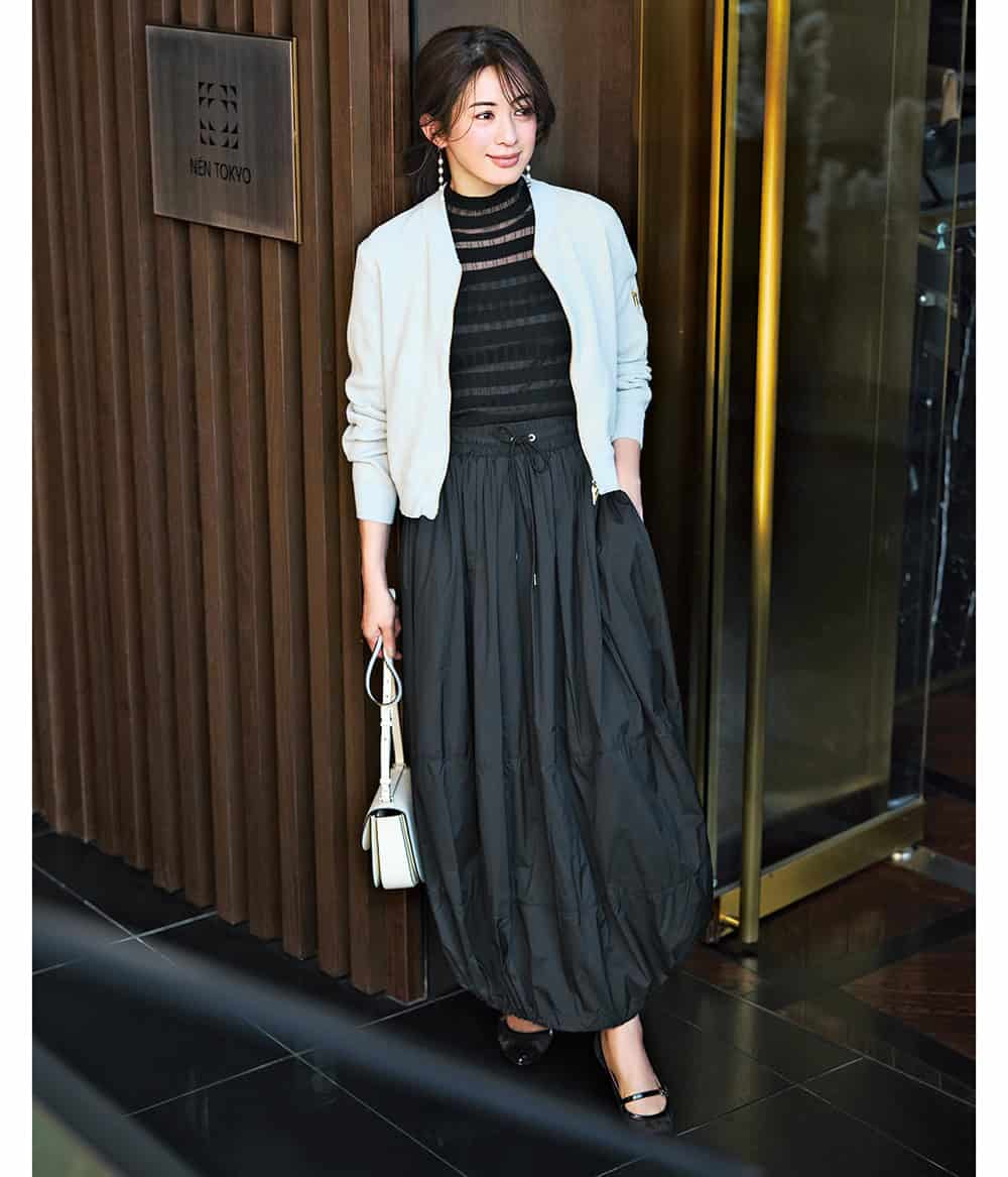 ブルゾン¥61,600スカート¥49,500(ともにタトラス/タトラス カスタマーセンター)ニット¥25,000(シーニュ)バッグ¥187,000(ボナベンチュラ)パンプス¥36,300(ファビオ ルスコーニ/伊勢丹新宿本店 本館2階 婦人靴)ピアス¥33,000(リューク)