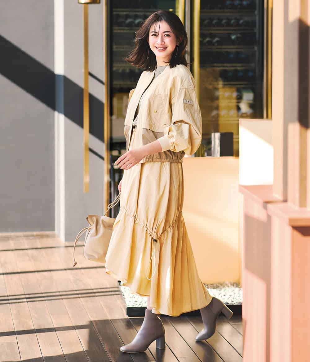 甘くて今っぽいベージュカラーでショート丈アウターを自分らしく堪能! ペールイエローよりのベージュは、今年のトレンドカラー。マットな素材感なら、より今っぽいムードに。