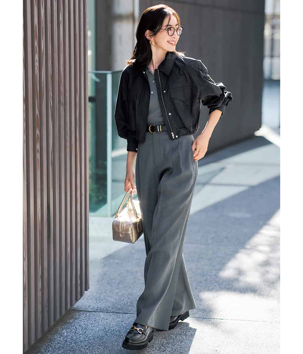 ブルゾン¥96,800(タトラス/タトラス カスタマーセンター)シャツ¥44,000パンツ¥44,000(ソブ/フィルム)バッグ¥53,900(ヴァジック/ヴァジック ジャパン)パンプス¥17,600(ダイアナ/ダイアナ 銀座本店)ピアス¥34,100(プリュイ/プリュイ トウキョウ)