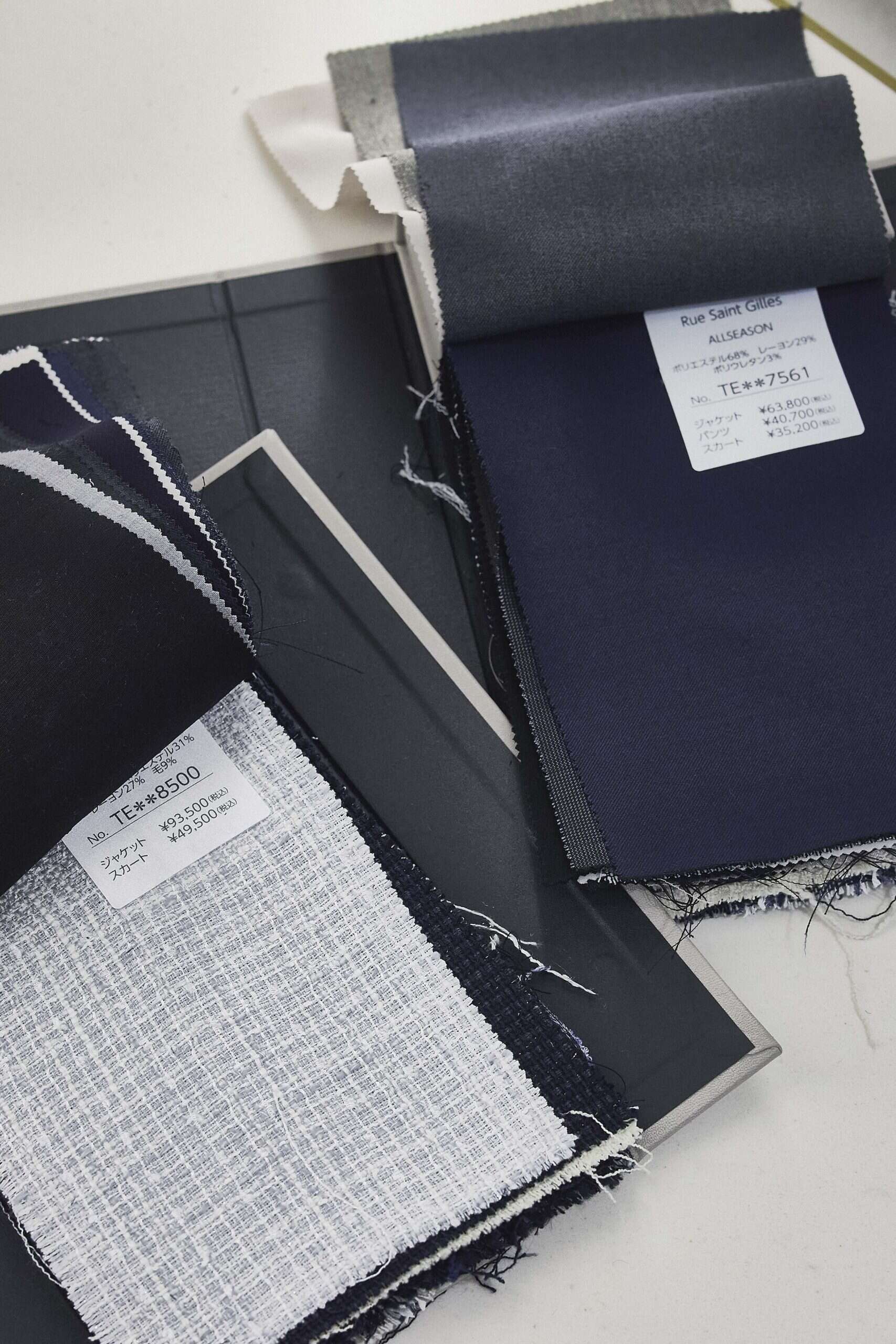 小仲「光沢感のある生地にしたいなと思っていたけど、光沢だけでも薄手からやや厚手まで色々だね。ジャケットを軽ハオリのように着られる薄手の生地も気になるけど、ハリのある上質感も捨てがたい…」