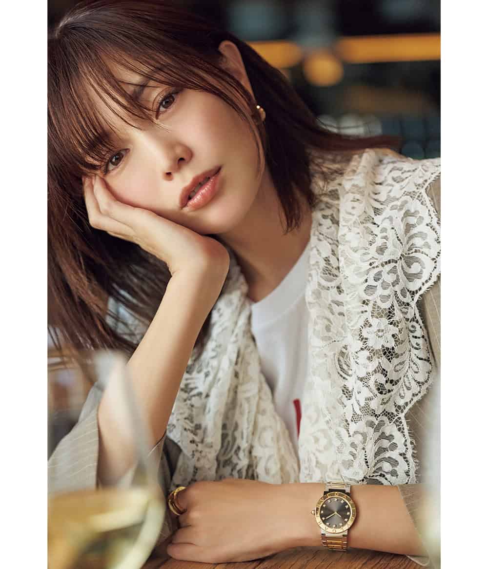 ゴールドとステンレスティールのコンビ素材で、年齢を重ねていく腕にも映える生涯名品。時計「ブルガリ・ブルガリ」〈YG×SS×D、ケース径33㎜、クオーツムーブメント〉¥1,474,000ピアス「ビー・ゼロワン」〈YG×D〉¥836,000リング「ビー・ゼロワン」〈YG×D〉¥775,500(すべてブルガリ/ブルガリ・ジャパン)レースベスト付きジャケット¥31,900(メゾンスペシャル/メゾンスペシャル 青山店)カットソー¥16,500(ウィム ガゼット/ウィム ガゼット 玉川髙島屋S・C店)