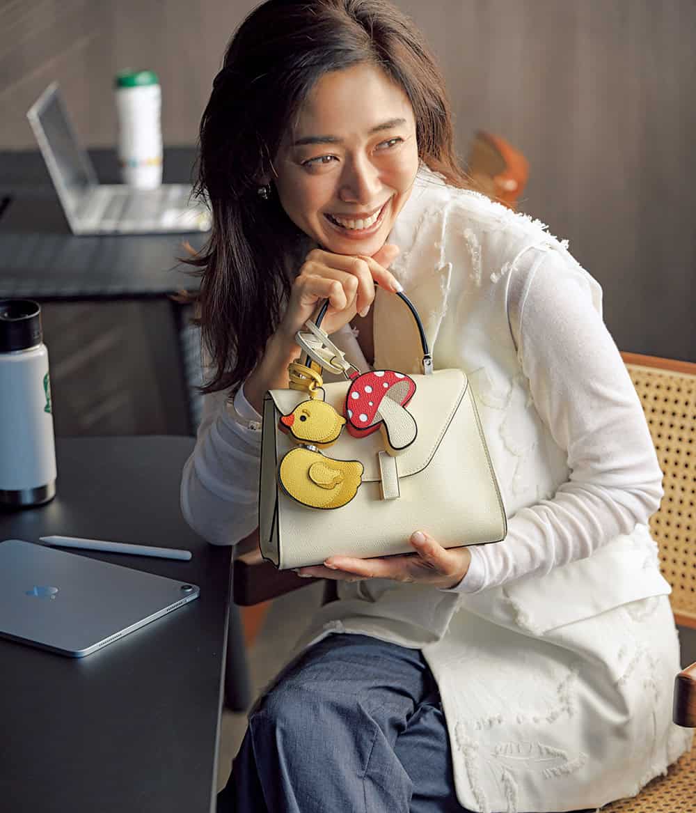 バッグ¥594,000 バッグチャーム[ダック]¥111,100 バッグチャーム[マッシュルーム]¥95,700(すべてヴァレクストラ/ヴァレクストラ ジャパン) ジレ¥198,000(DES PRÉS/DES PRÉS) ロングスリーブTシャツ¥18,700(スリードッツ/スリードッツ表参道店) パンツ¥24,200(アマカ/SANYO SHOKAI カスタマーサポート) ピアス¥25,300〈ウノアエレシルバーコレクション〉 バングル¥28,600〈ワンエーアールバイウノアエレ〉(すべてウノアエレ ジャパン)