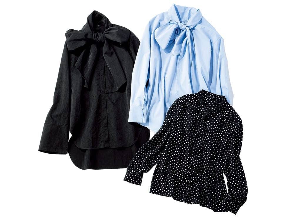 〈右〉フェミニンなとろみ素材。ドットブラウス¥23,100(トランスワーク/SANYO SHOKAI カスタマーサポート)〈中〉光沢感が上品。サックスブラウス¥19,910(23区/オンワード樫山)〈左〉リボンの形が美しくキープされるハリ感のある素材。ブラックブラウス¥30,800(ル フィル/ル フィル ニュウマン新宿店)