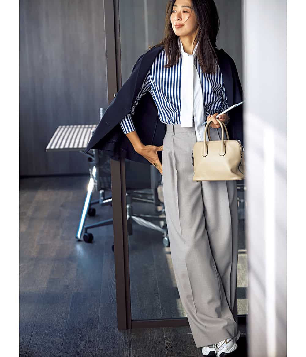 40代のオフィス服は、きちんと感だけを重視すると〝怖い〟と思われてしまうことも。ボウタイのさりげない甘さが和やかなムードを作り、自然なコミュニケーションが生まれます。
