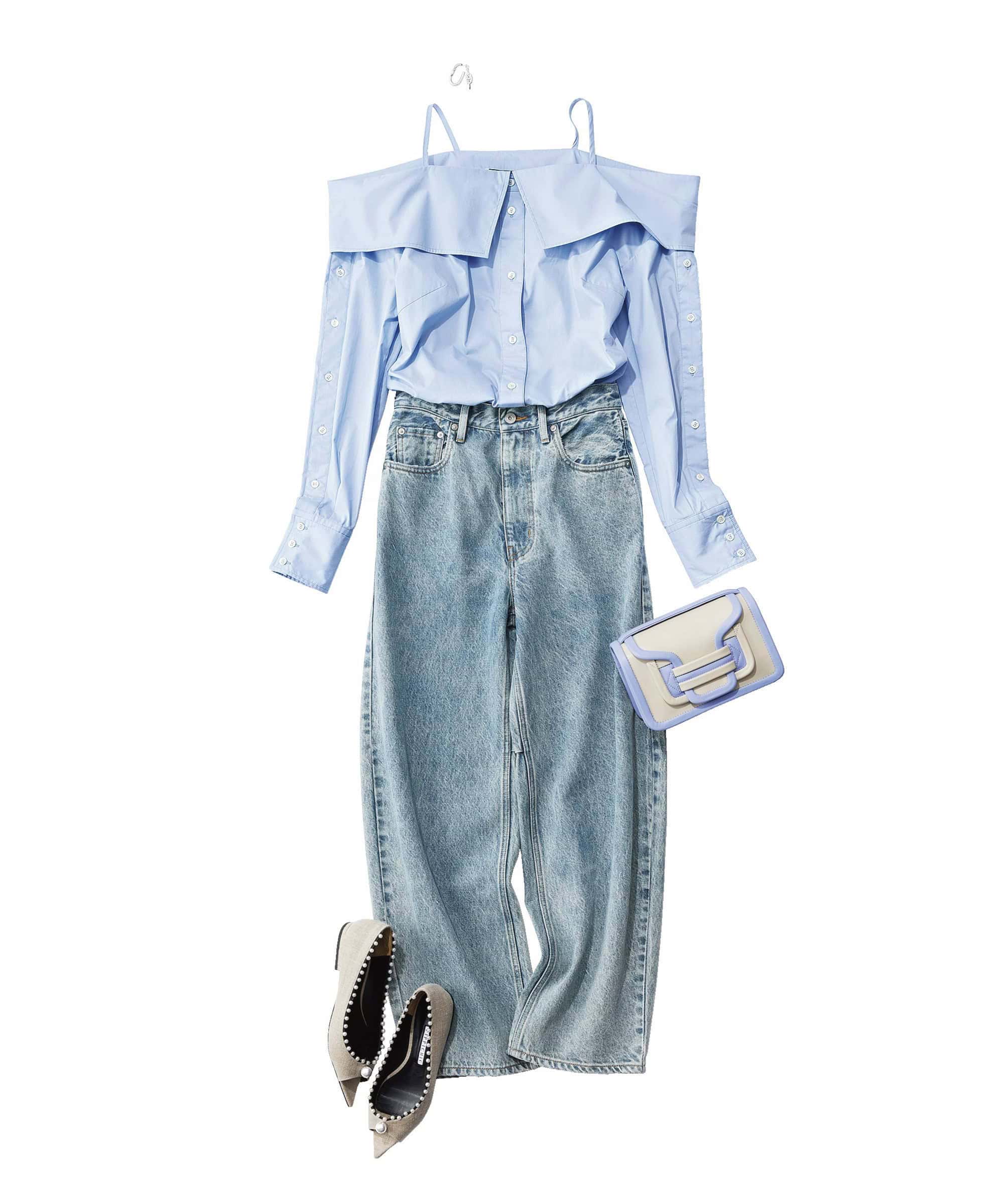 ヘルシーな肩見せデザインが女らしい色気を演出。袖先まで続くシャツボタンのような落ち感もあるので、抜け感デニムとも不思議とマッチ。仕上げにパールパンプスを合わせれば、グッとフェミニンに寄せられます。