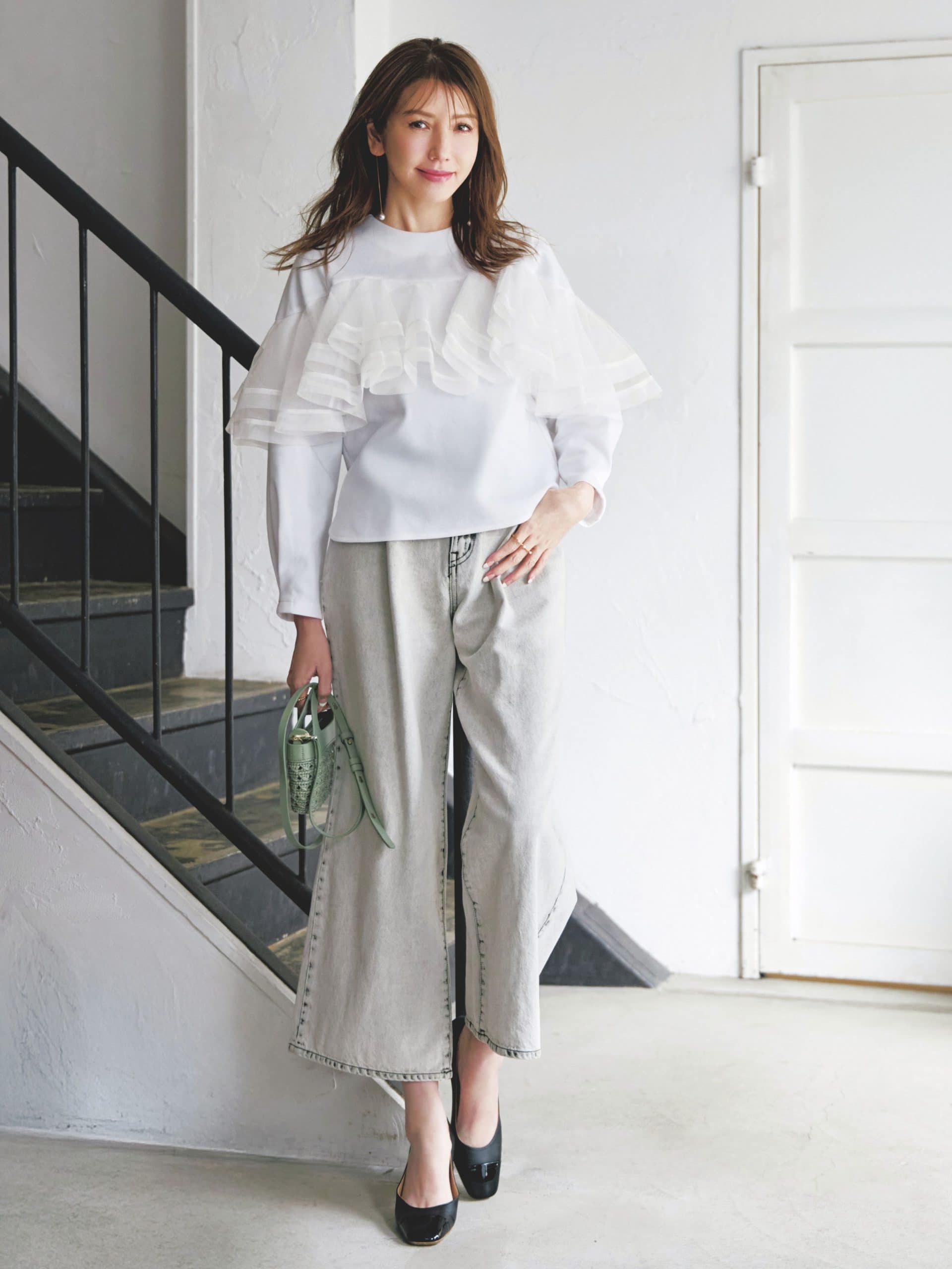 主張が控えめな薄色デニムは、上半身に視線を持っていきやすいのがポイント。ドレープの効いたチュールトップスを主役に動きを生み出すことで、グッとエレガントな雰囲気に。足元がほっそり見えるアンクル丈も上品さを高めるのに最適です。