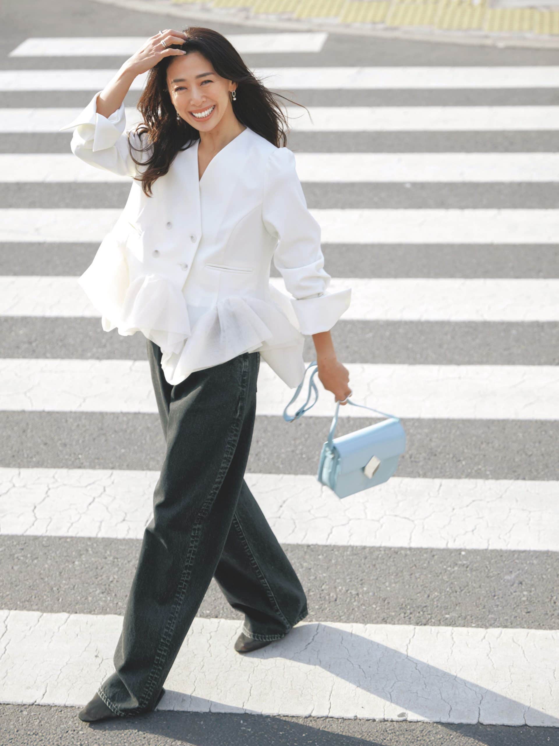 ドレッシーなアシメフリルがデニムとの匙加減に大活躍。あえて真逆テイストのデザインをMIXすることで、程良くバランスが取れた甘辛な着こなしに。どちらも丸みのあるシルエットなので、体型をカバーしつつ、女性らしさを存分にアピールできます。
