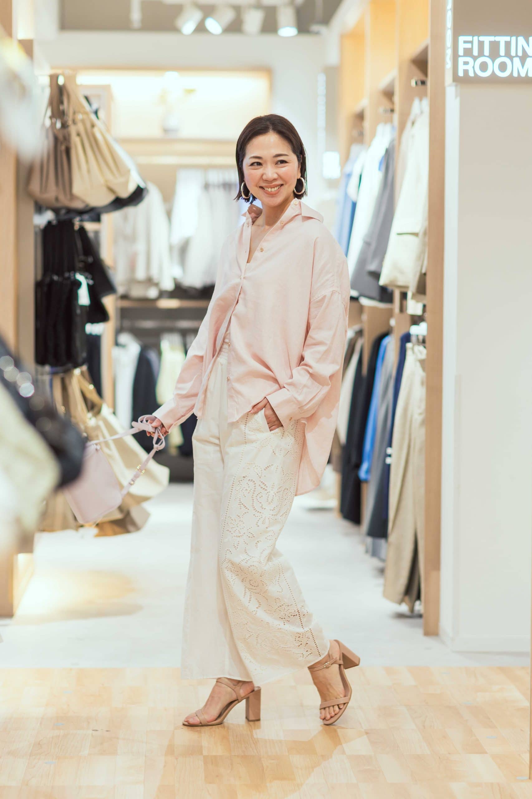 「今年も人気のレースアイテムは、サイドに刺繍デザインをあしらったレースパンツを取り入れて華やかに。見せすぎない程よい透け感が、大人にちょうどいい抜け感を演出します。ワイドシルエットで脚のラインを拾わず、軽やかな春の装いに。トップスは顔映りを明るくする淡いピンクのシャツをオーバーサイズで羽織り、こなれた雰囲気に。軽やかな着心地で真夏の紫外線対策にも活躍してくれそうです」