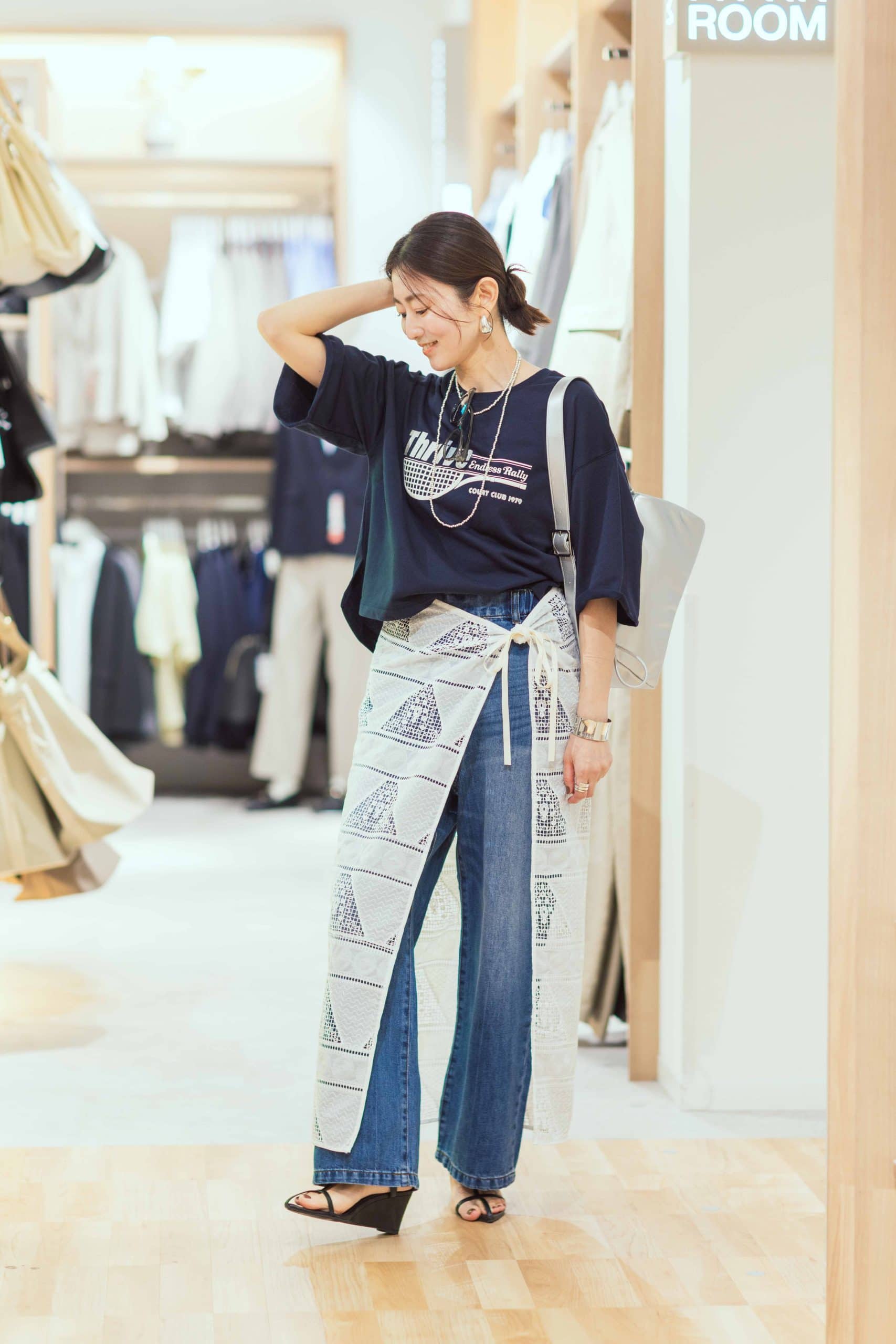 「いつものTシャツ×デニムにレースラップスカーフを重ねるだけで、一気に今年らしい雰囲気に。パッチワーク風の生地がヴィンテージライクなニュアンスをプラスし、シンプルコーデもぐっとこなれた印象に仕上がります。バッグはシルバーでアクセントをつけ、足元はヒールサンダルで抜け感を意識。ラフになりすぎない、大人のバランスにまとめました」