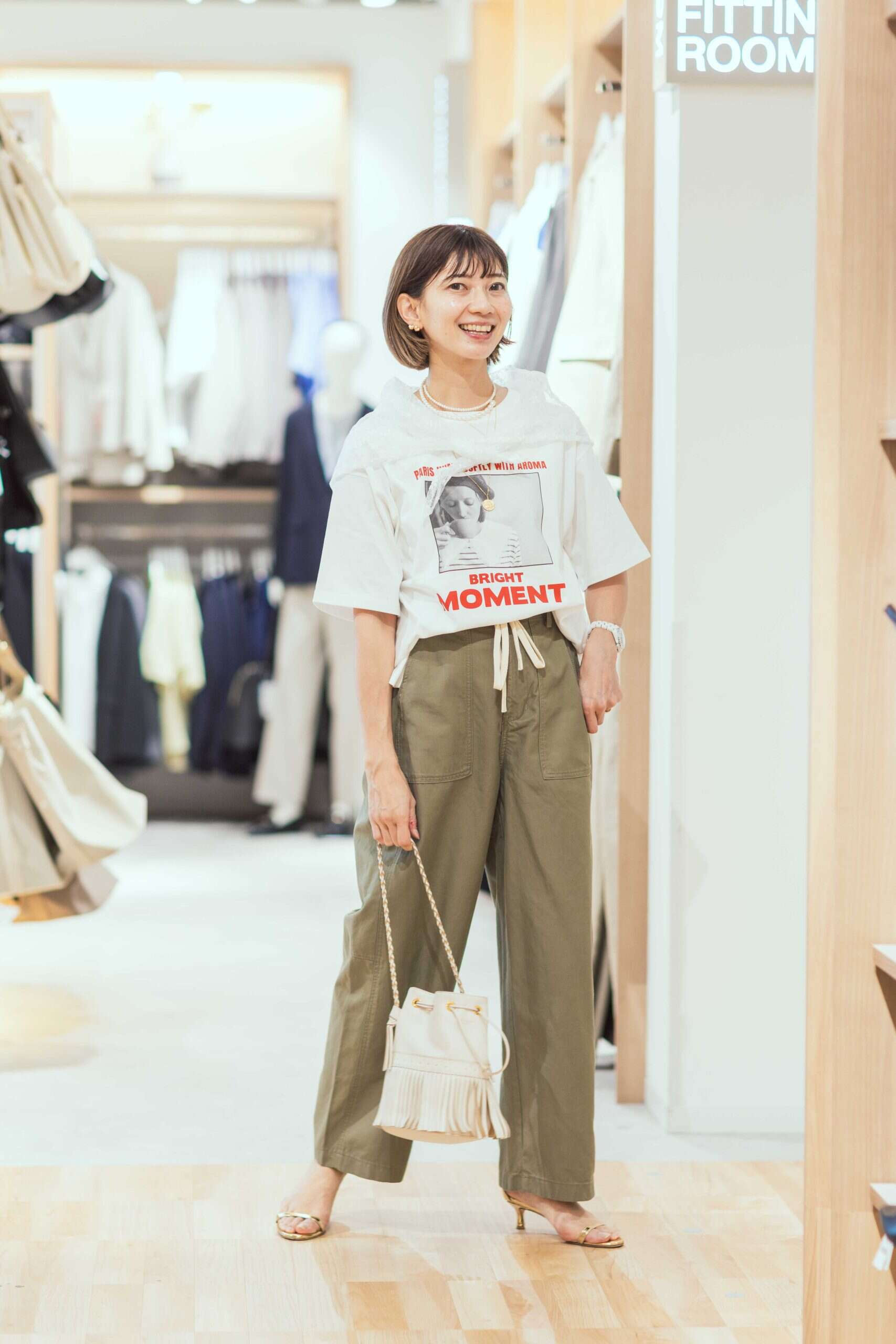 マルチレース三角スカーフ¥2,090 ヘビロッTフリルプリント半袖¥3,990 GOODチノベーカーパンツ¥5,490 (すべてグローバルワーク/アダストリア カスタマーサービス)※トップスはSHORTサイズ、パンツはSサイズを着用 靴、バッグ(私物)