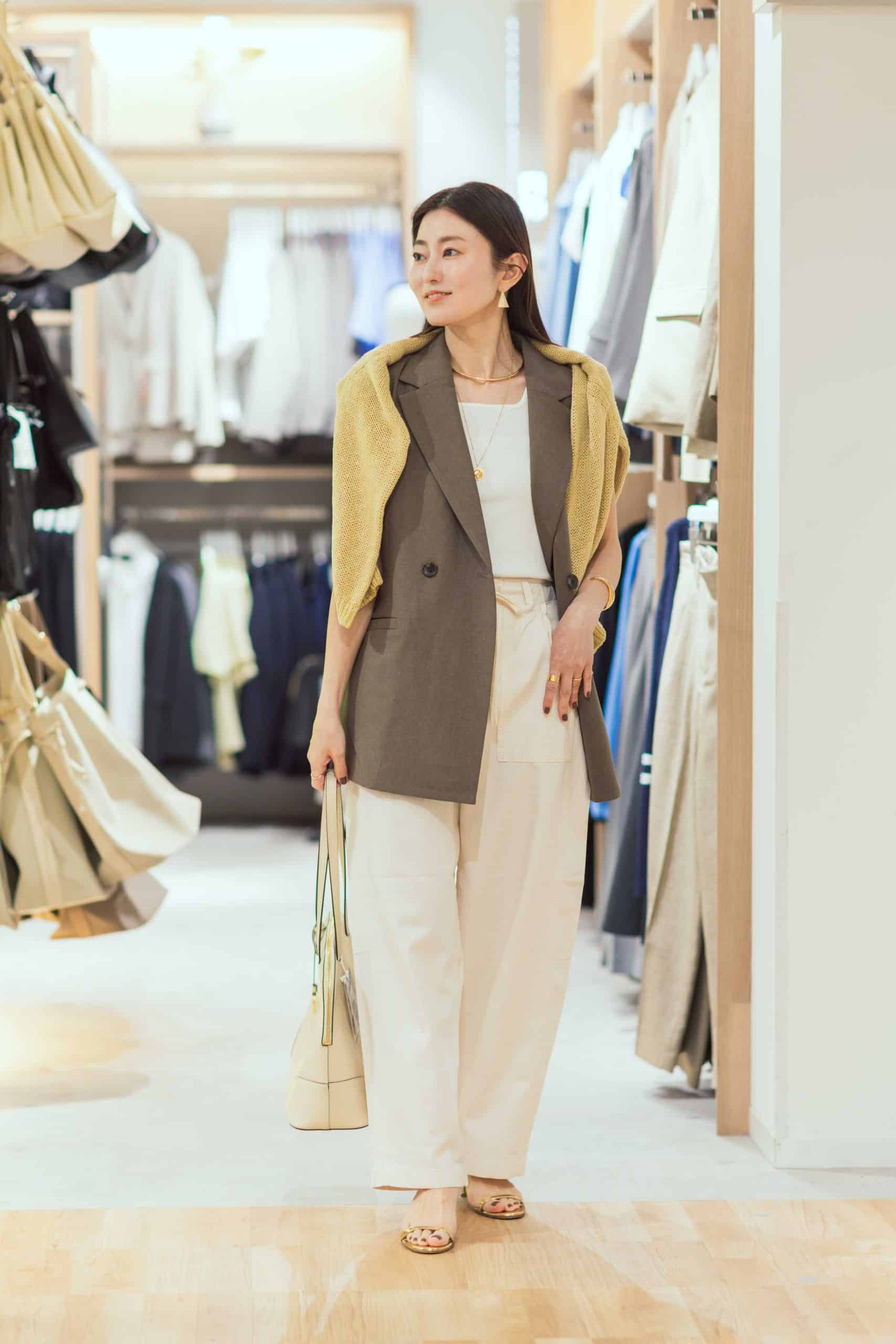「腰まわりをカバーしながら、品の良さをプラスしてくれるジレは40代の強い味方。こちらはマシンウォッシャブルで洗濯後もシワになりにくく、暑い時期でも気兼ねなく着られるのが魅力です。インナーとパンツは白のワントーンでまとめ、リネン混のざっくりとしたイエローのカーディガンでアクセントをプラス。ジレを羽織るだけで、きちんと感のある上品シンプルなお仕事コーデに仕上がります」