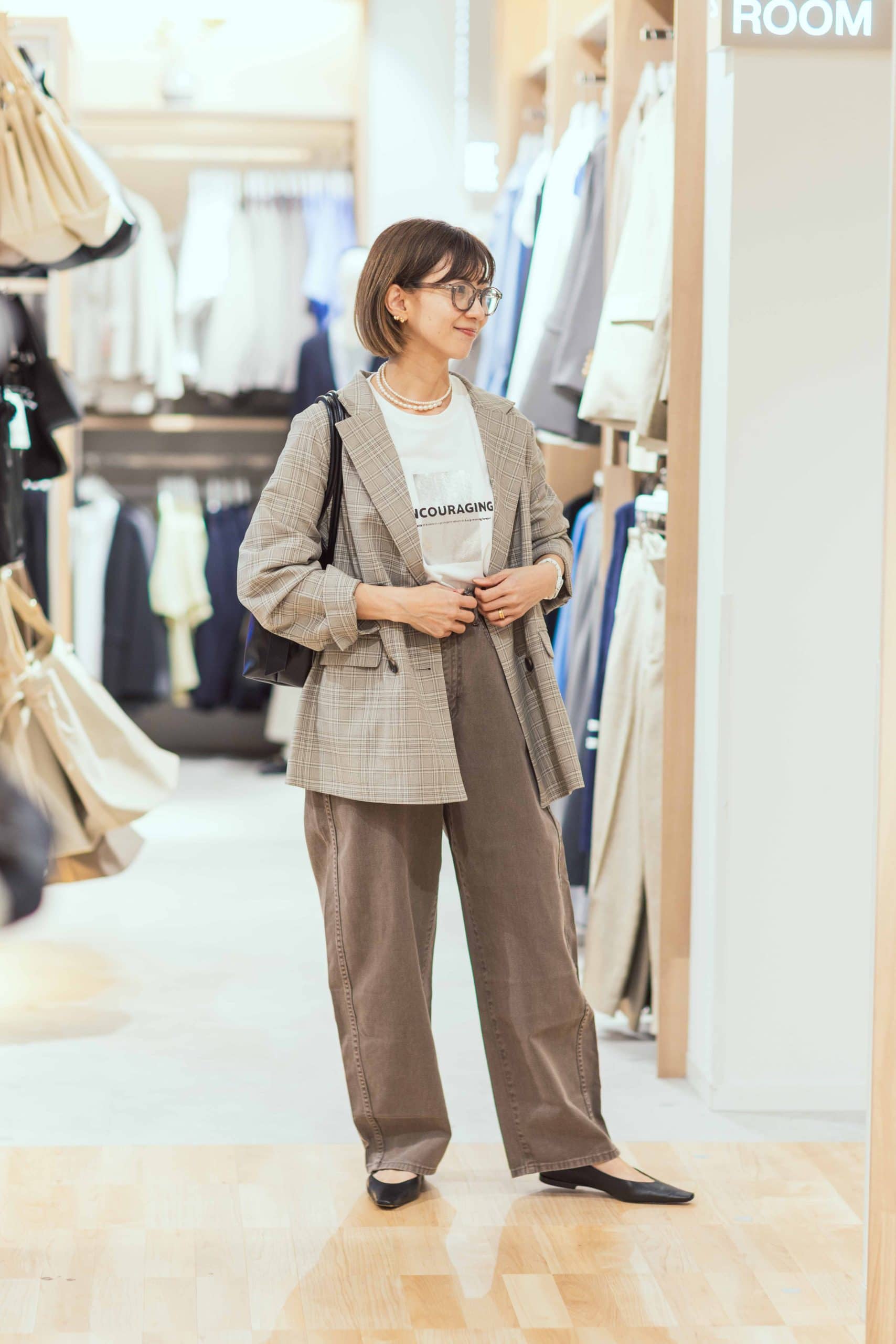 「汗ばむ季節には、デニム×スウェットTシャツにイージーケアジャケットを羽織った気負わないお仕事スタイルが頼れる存在。落ち着いたブラウンベージュでトーンを整えれば、カジュアルでもきちんと感はしっかり。新鮮なチェック柄ジャケットを取り入れるだけで、定番お仕事スタイルもぐっと洗練見えします」