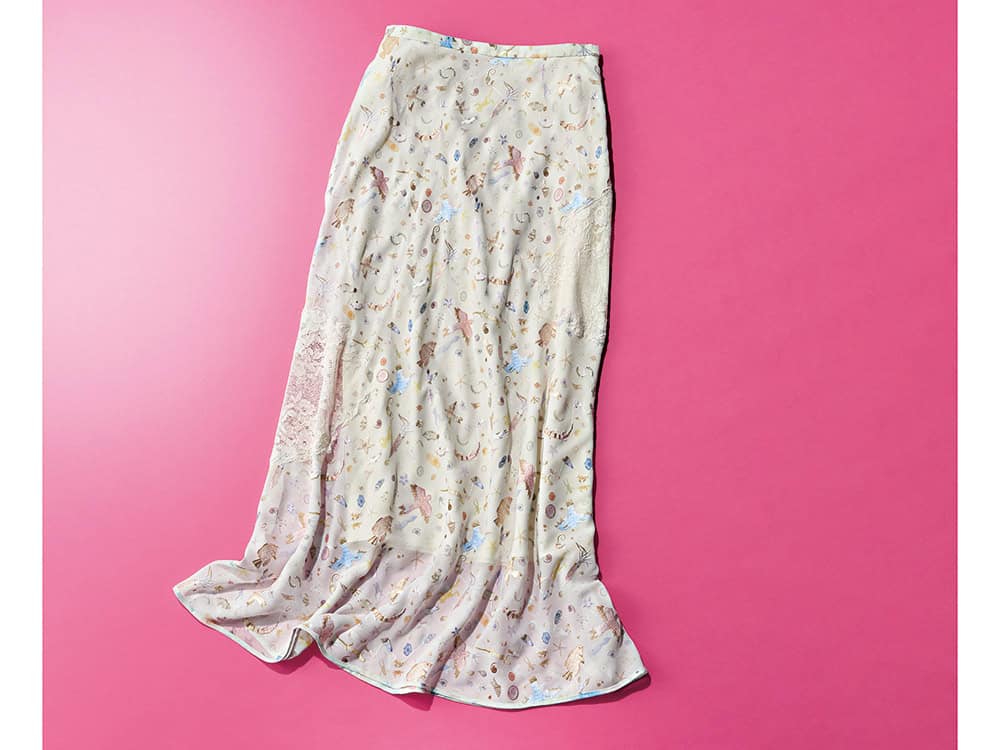 刺繡の上からインクジェットプリントを施した贅沢な一着。淡い色味と繊細なレースの組合わせはアートのようです。スカート¥132,000(ロンハーマン/ロンハーマン)