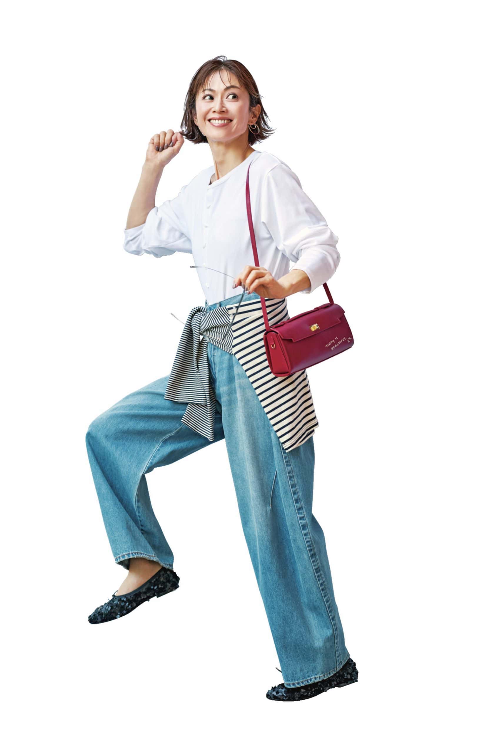 シューズ¥31,900(ペリーコサニー/アマン)フィッシュボタンカットソー¥20,900(シー/エスストア)デニム¥23,100 (ミースロエ/ミースロエ ルミネ新宿1店)腰に巻いたボーダートップス¥17,600(RHC/RHC ロンハーマン)バッグ¥253,000(アニヤ ハインドマーチ/ロンハーマン)サングラス¥25,800 (カリン/STARDREAM JAPAN)ピアス¥41,800(プラウ)