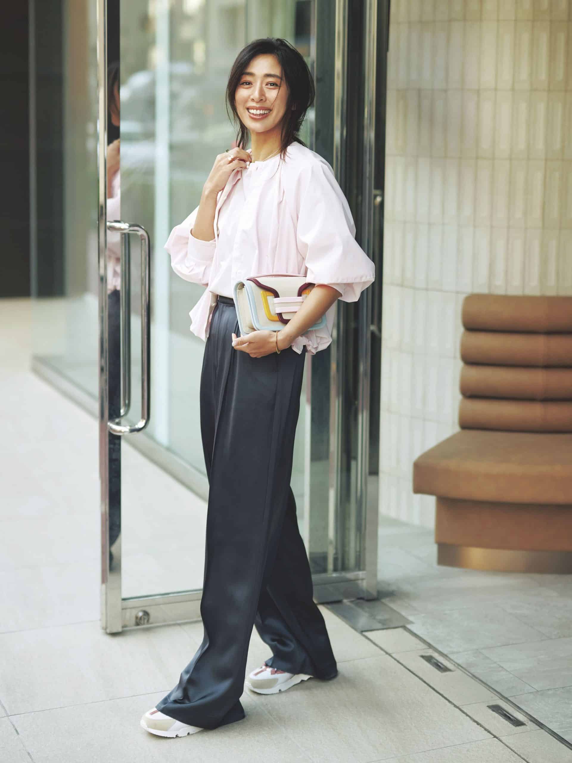てろんと落ち感のあるパンツには、動きのあるブラウスが相性抜群。ふわっとした華やぎのあるシルエットに加え、フェミニンな色味が上品さを後押し。スニーカースタイルだけれど、レストランやホテルのロビーでも浮かない上品さ。
