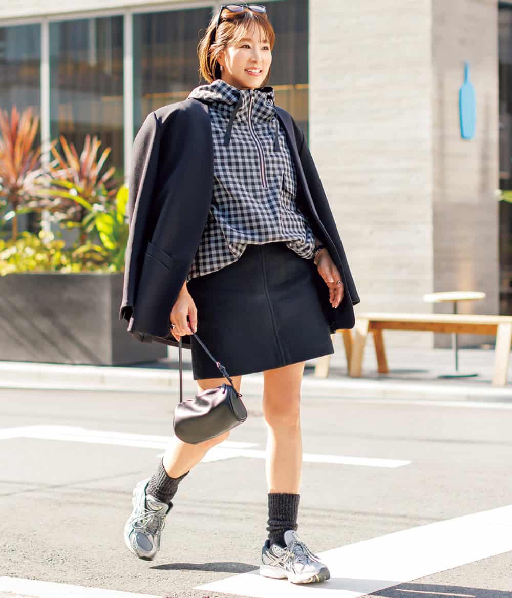 ミニスカにはアノラックパーカを合わせてスポーツMIXに。ルーズソックスとボリュームスニーカーで脚の細見え効果を狙います。