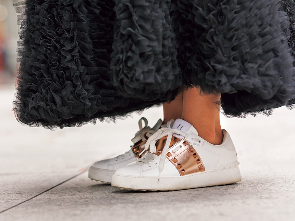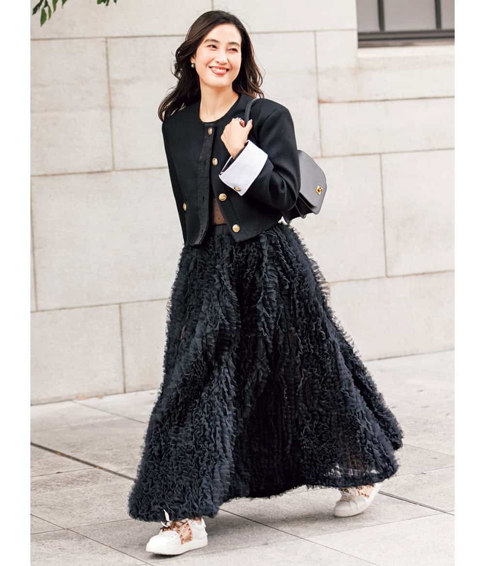 チュールスカートの裾からチラッと見えるスニーカーのスタッズが甘辛のポイントに。抜け感を出すために、素肌が見えるくるぶしソックスを合わせます。