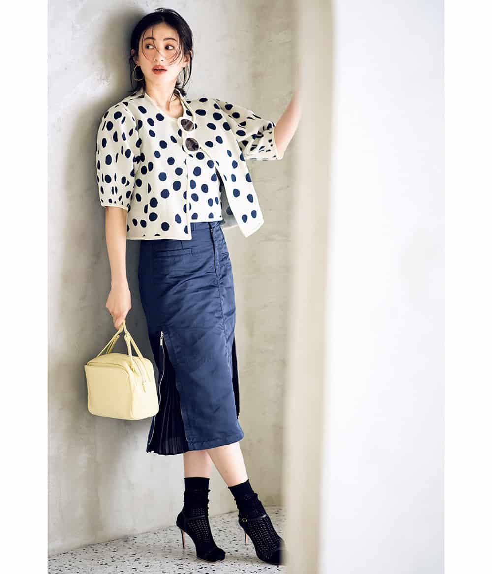 サイドのジップとプリーツが洒落見え。タイトにキャッチーなドット柄が視線を惹くアクセントに。