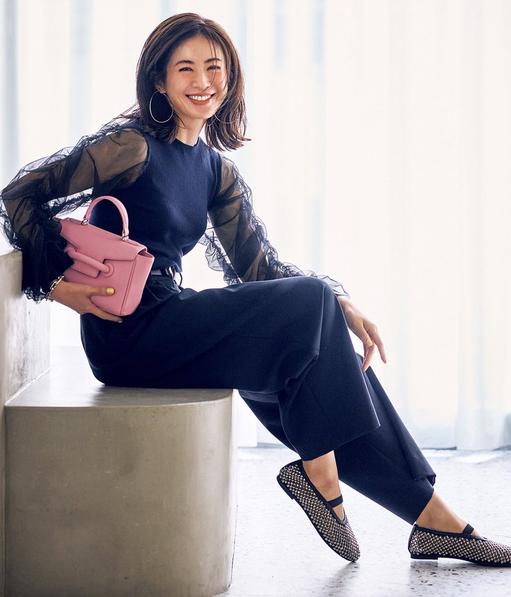 ニット¥53,900(コルコバード/フィルム)パンツ¥33,000(バッカ/ビー エディション ニュウマン新宿店)バッグ¥50,600(ヴァジック/ヴァジックジャパン)パンプス¥23,980〈ユナイテッドアローズ〉ベルト¥27,500〈ア ヴァケーション〉(ともにユナイテッドアローズ 六本木ヒルズ店)ピアス¥42,900(バージュエリー/エルディスト ショールーム)ブレスレット¥28,600(シーエックスシー/アマン)