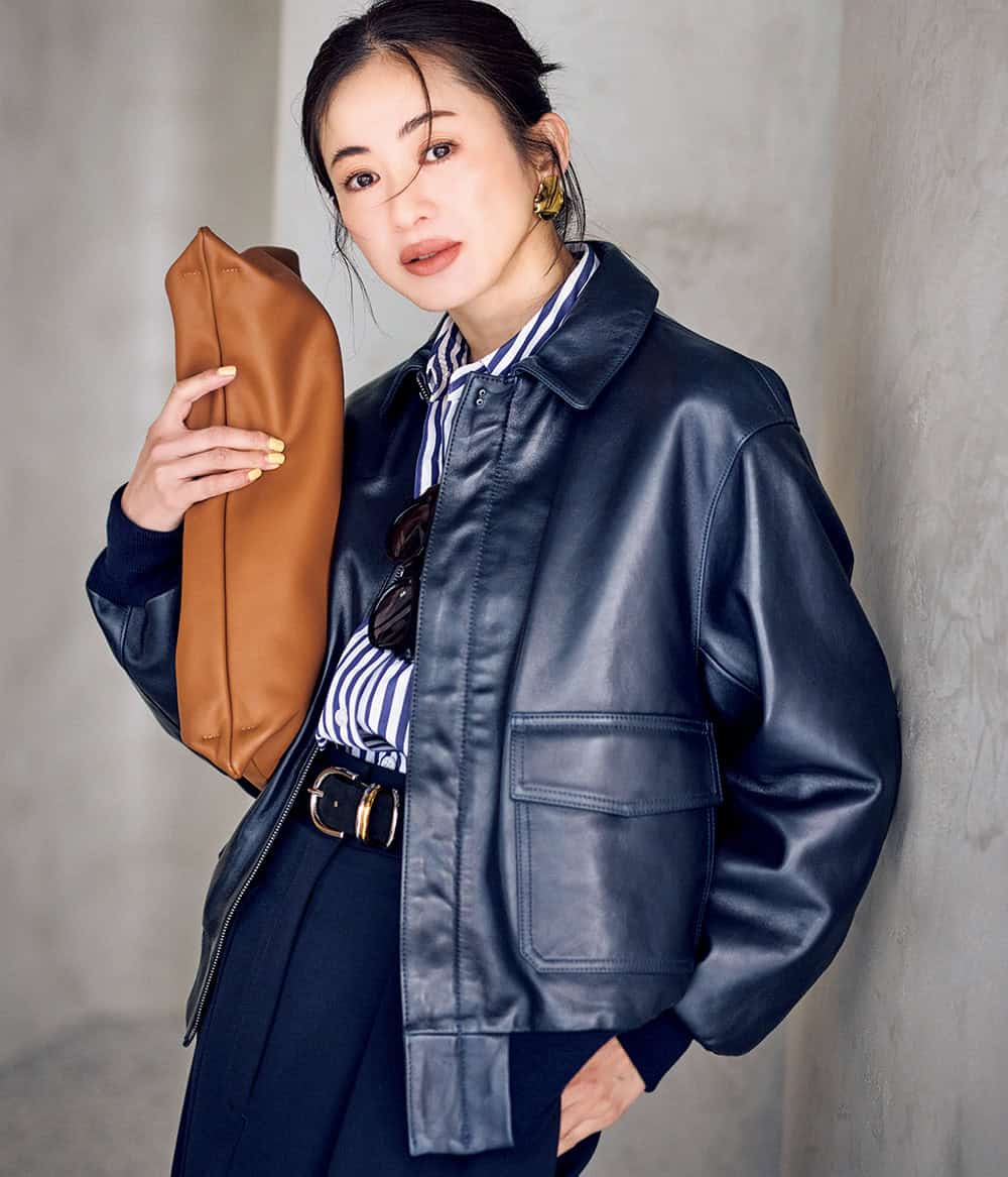 レザーのクールさとネイビーの柔らかさがベストバランス。ネイビーのラムレザーは黒ほど辛口にならず合わせやすいのも魅力。ストライプシャツやスカートとネイビーでつなげて知的に。