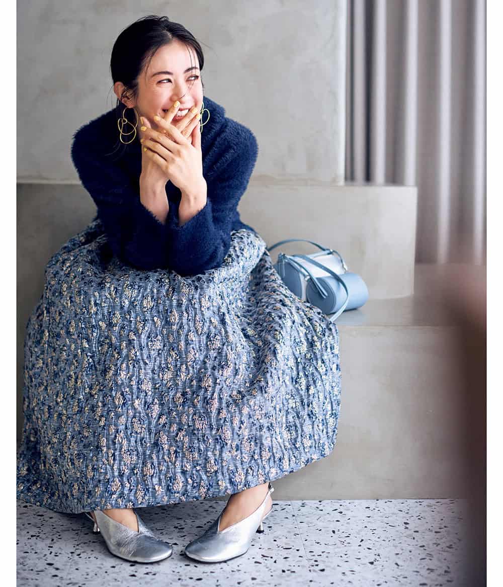 ニット¥19,800(リエス)スカート¥70,400(コルコバード/フィルム)バッグ(4月発売)¥35,200(ヴァジック/ヴァジックジャパン)パンプス¥25,300(オデット エ オディール/オデット エ オディール 新宿店)ピアス¥73,700リング¥44,000(ともにバージュエリー/エルディスト ショールーム)