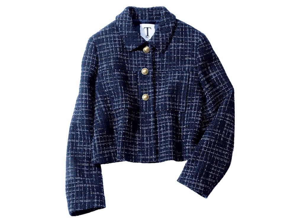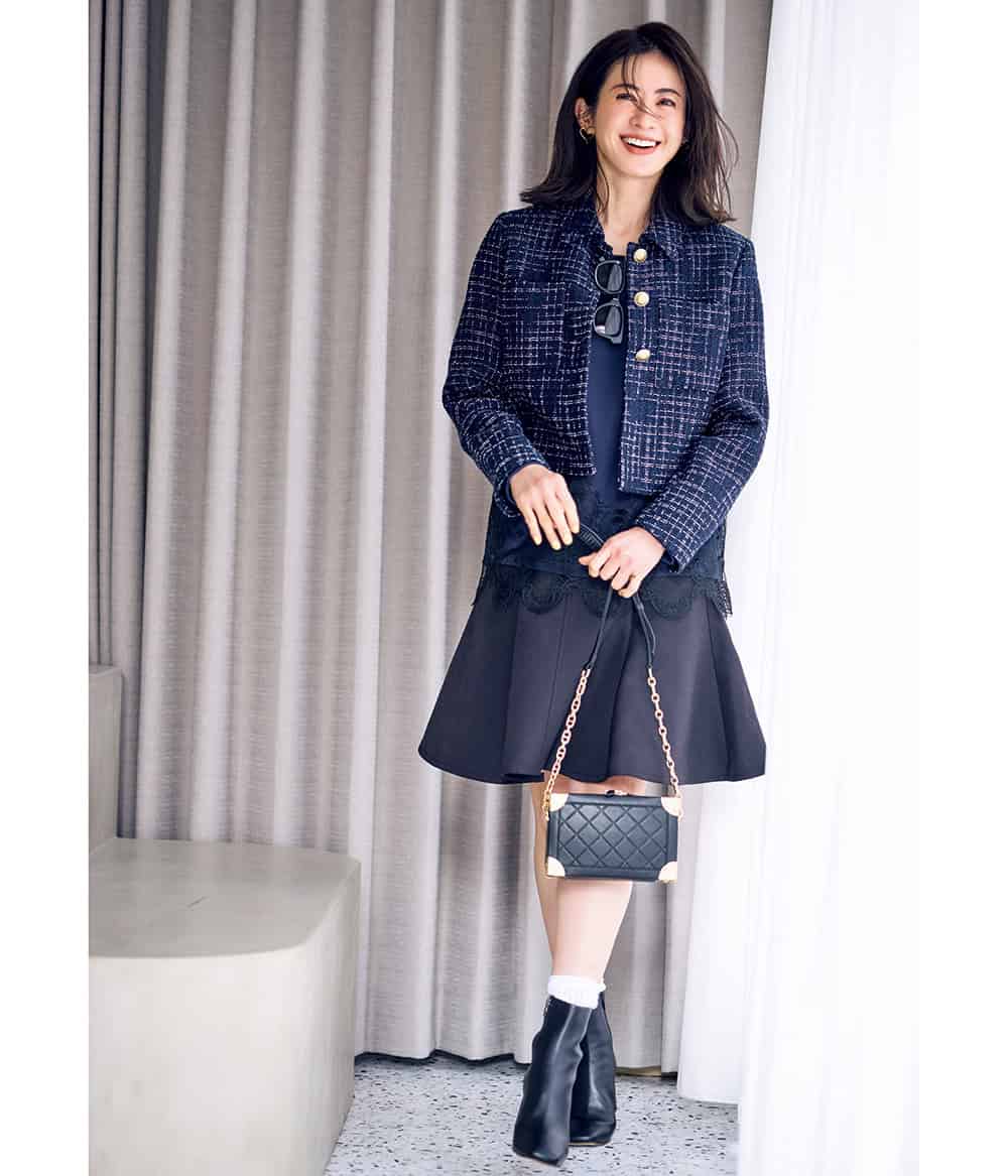 ネイビーツイードが担保する端正さを頼りに、大人のミニスカを堪能。