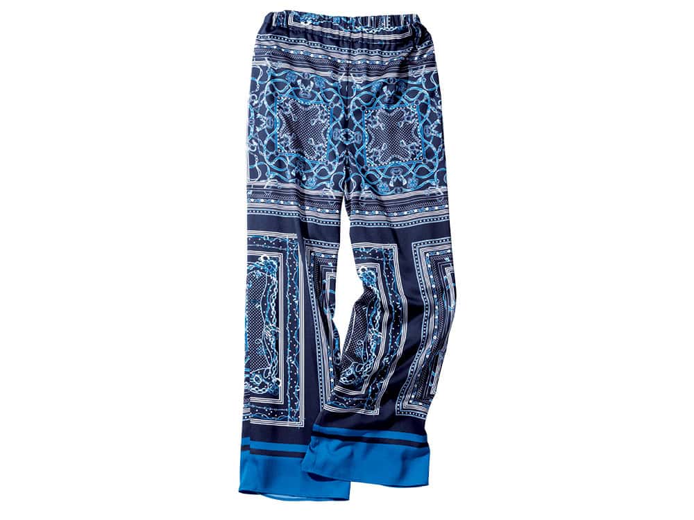 少し勇気のいる柄パンツもネイビーなら大人ラグジュアリーに。柄を主役に色で統一感を持たせると視線も散らからず洗練感UP。
