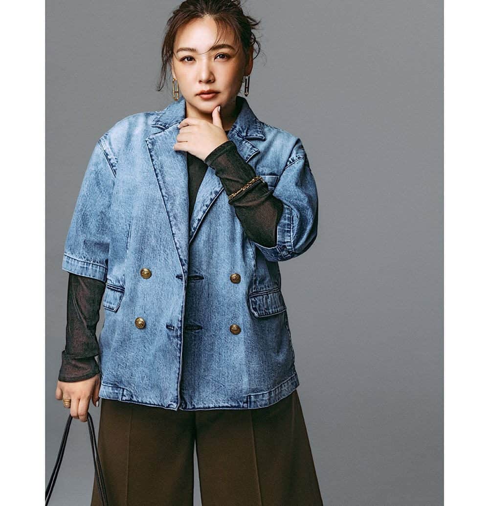 今年トレンドの半袖JKは、ざっくり羽織れるサイズ感が使い勝手良し。隠しつつも、半袖だからメリハリよく仕上がります。レイヤード次第で、春の今から夏まで大活躍。異素材の黒を入れたら締まって見えるし、アクセ使いで女っぽバランスに仕上がります。