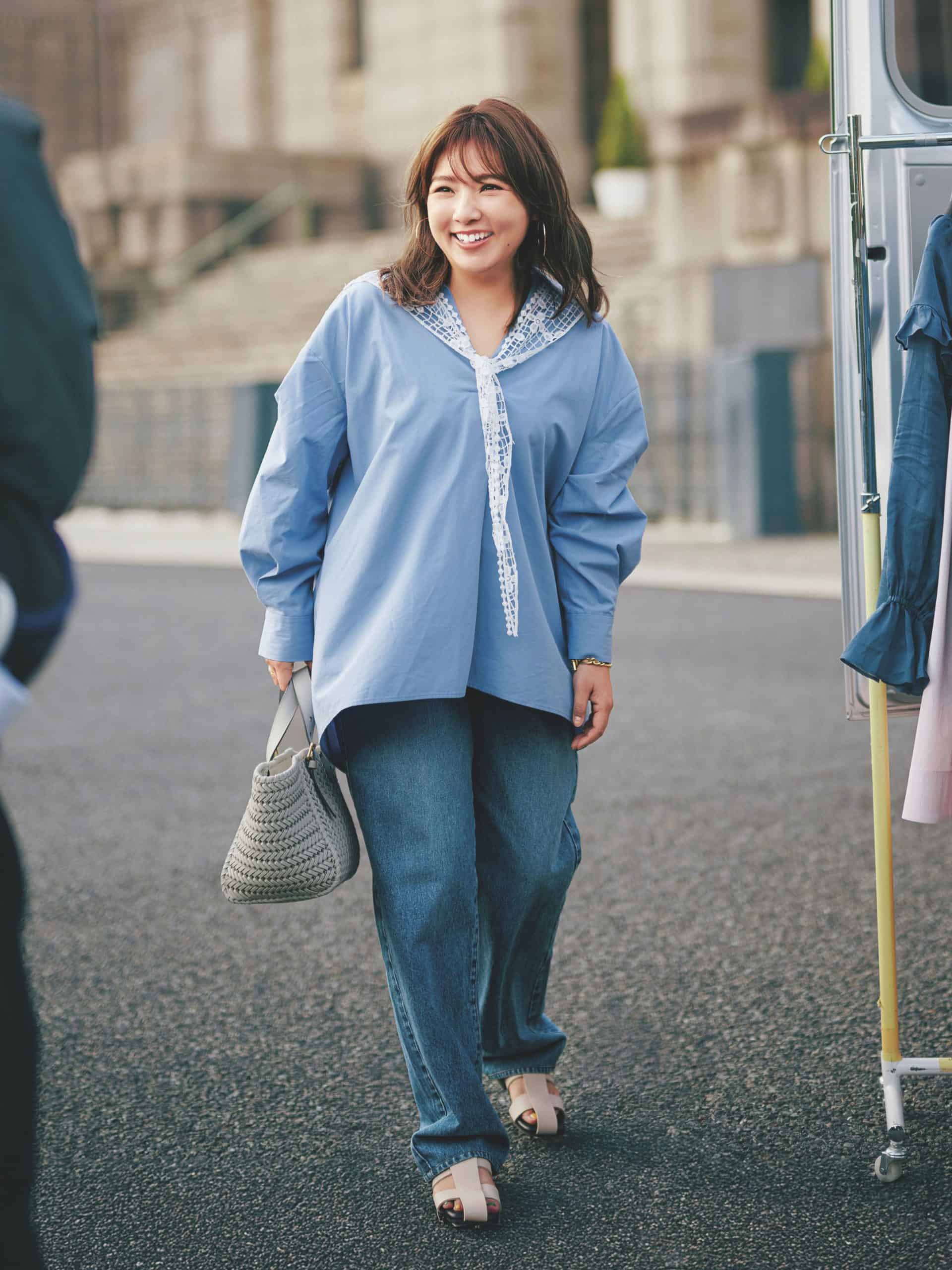 レーススカーフシャツ¥23,100(カデュネ)デニムパンツ¥18,700(ニードバイヘリテージ/ゲストリスト)バッグ¥181,500(アニヤ・ハインドマーチ/アニヤ・ハインドマーチ ジャパン)サンダル¥13,200(タジャ/ティースクエア プレスルーム)ピアス¥10,120〈ケネス・ジェイ・レーン〉ブレスレット¥17,800〈アドラル〉(ともにZUTTOHOLIC)リング¥224,400(ココシュニック)