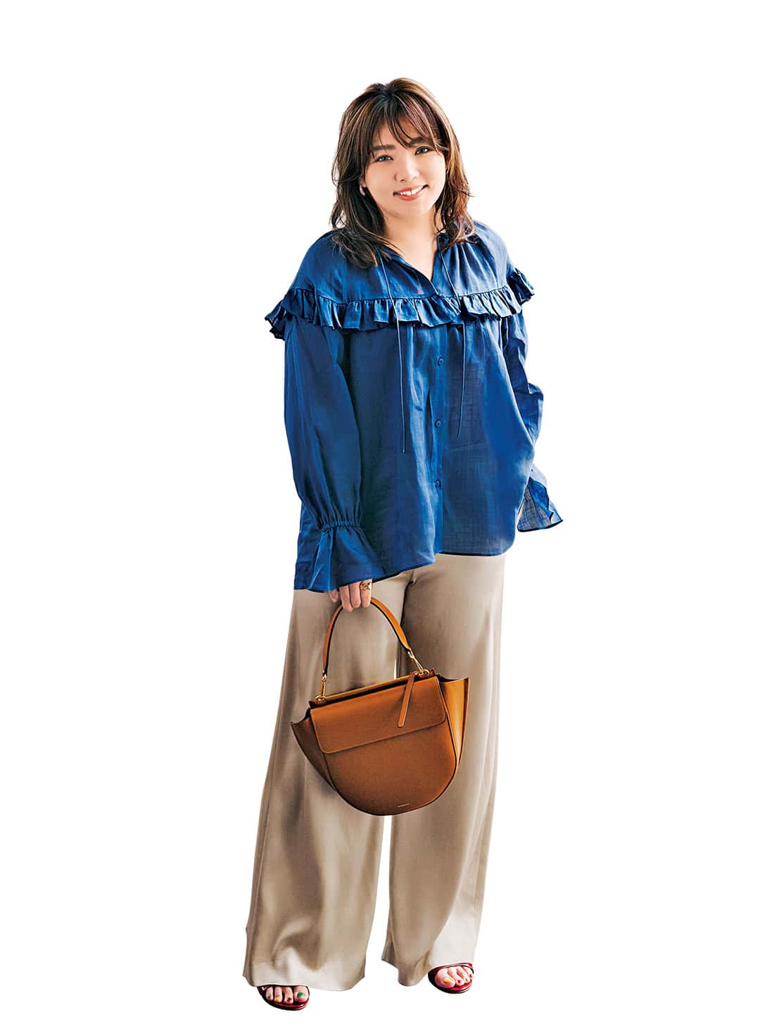 ブラウス¥38,500(デパリエ/デパリエ 伊勢丹新宿店)パンツ¥23,100(LE PHIL)バッグ¥177,100(ワンドラー/ブルーベル・ジャパン)サンダル¥29,700(ツル バイ マリコ オイカワ)ピアス¥29,040(ピニャッタ/ZUTTOHOLIC)リング¥14,300(ワンエーアールバイウノアエレ/ウノアエレ ジャパン)