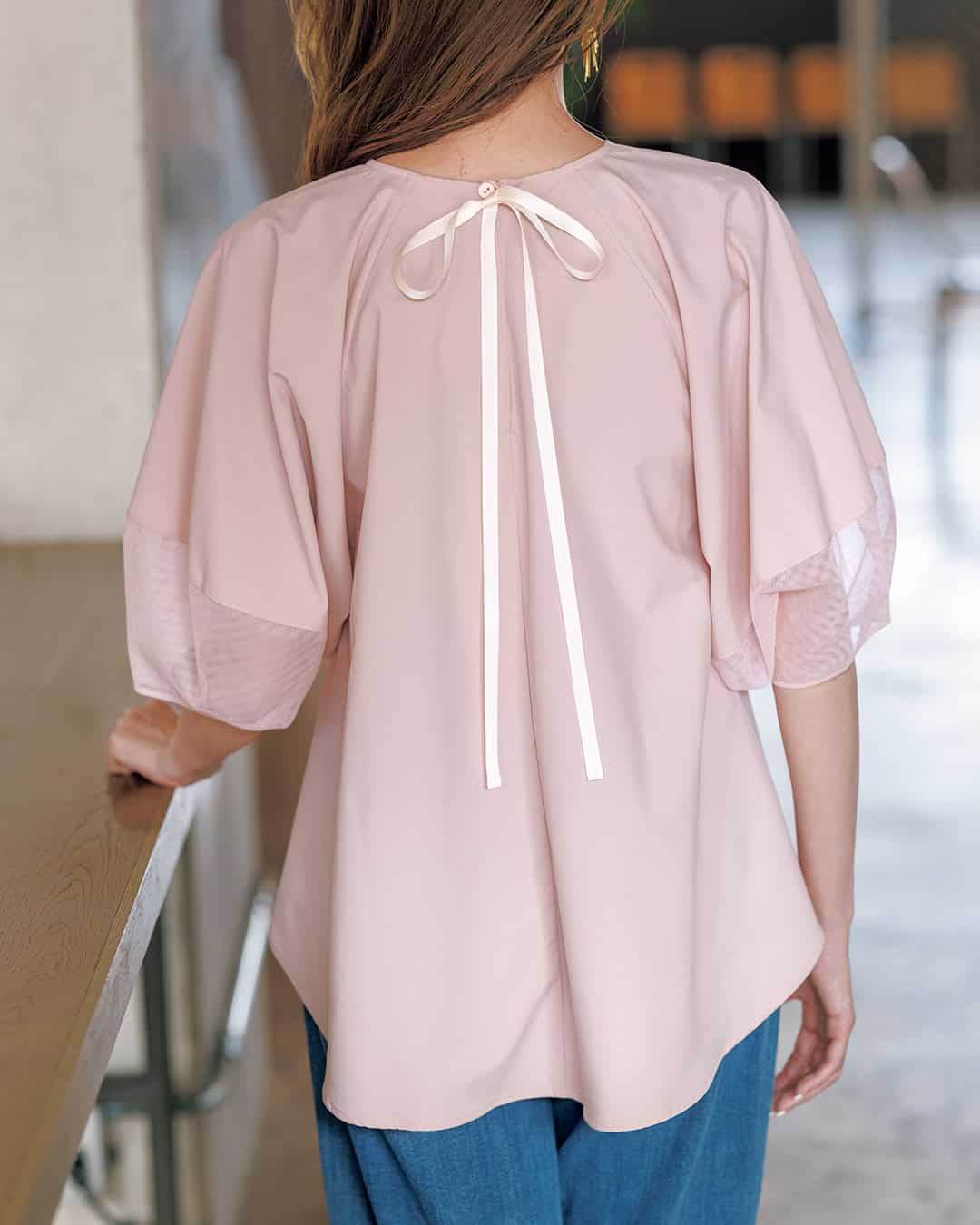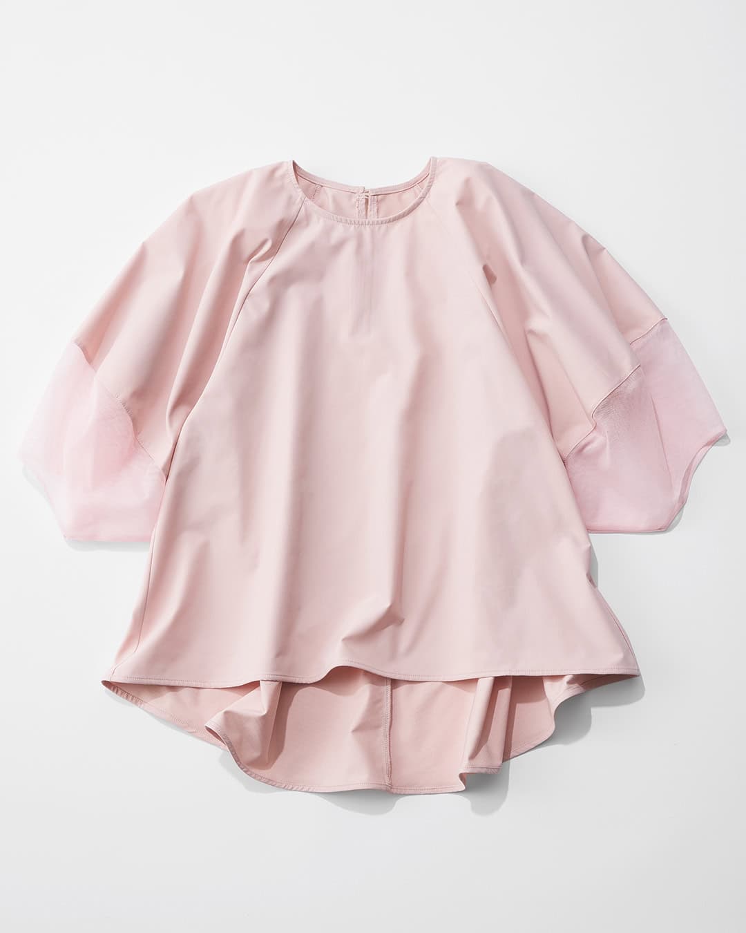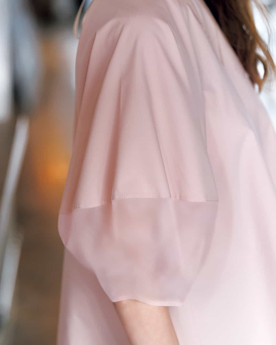 着るだけでオシャレ見えが叶う時短トップスは春夏必須です。ランタンのような形の袖はここ数年人気のあるデザイン。さらにそこにチュールを2枚重ね、程よい透けをプラスしトレンド感を意識しました。裾は前後差を付け1枚で着たときもバランスよく見えるようにし、さりげなく気になるヒップラインもカバー。スリットはラウンドカット、後ろもリボンをあしらってフェミニンさを出したり、こだわりの要素が満載です。身頃はシワになりにくい優秀素材を使用しています。