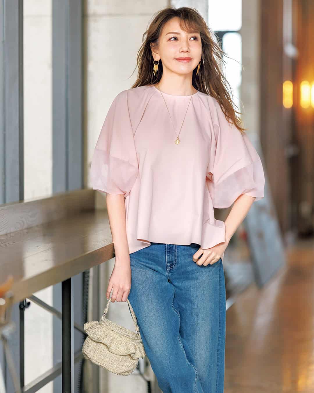 ④さりげないペプラム&パフスリーブの甘さが毎日コーデの味方に