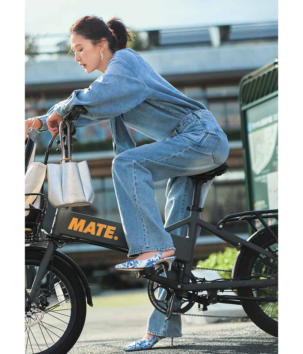 パンプス¥30,800(ツル バイ マリコ オイカワ)ブラウス¥44,000 パンツ¥33,000(ともにウィム ガゼット/ウィム ガゼット 玉川髙島屋S・C店)バッグ¥53,900(ジャンニ キアリーニ/ジャンニ キアリーニ 銀座店)トートバッグ¥79,200(ルッツ モリス/アマン)ピアス¥37,400ブレスレット¥82,500(ともにブランイリス/ブランイリス トーキョー)自転車《MATE GO+》¥220,000〜(MATE. BIKE JAPAN)
