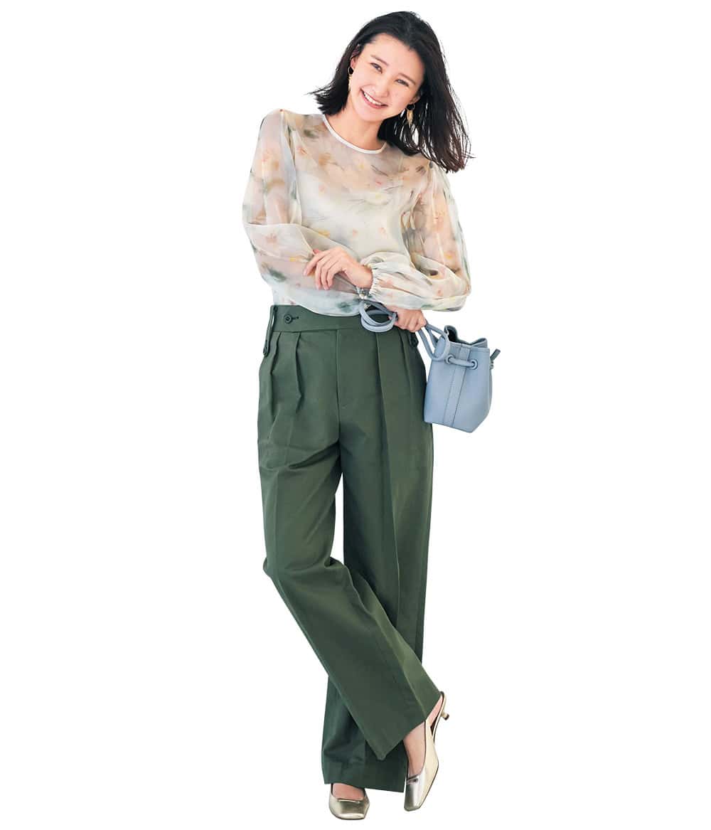 カジュアルなカーキのワークパンツはフェミニンなシアーブラウスとゴールドパンプスで更新! 足元をヒールにすれば華やかなシーンにもマッチ。