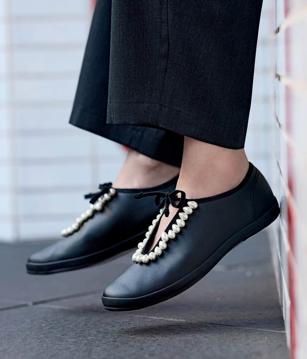 パール付きシューズ¥22,000(ラインヴァンド×ムーンスター/ラインヴァンド カスタマーサポート)コート¥39,600(ザ シンゾーン/シンゾーン 表参道本店)ニット¥42,900(アンスクリア/アマン)パンツ¥36,300(ロエフ/エイチ ビューティー&ユース)バッグ¥12,100(ヴェンディ/ジャック・オブ・オール・トレーズ プレスルーム)ピアス¥41,800(プラウ)