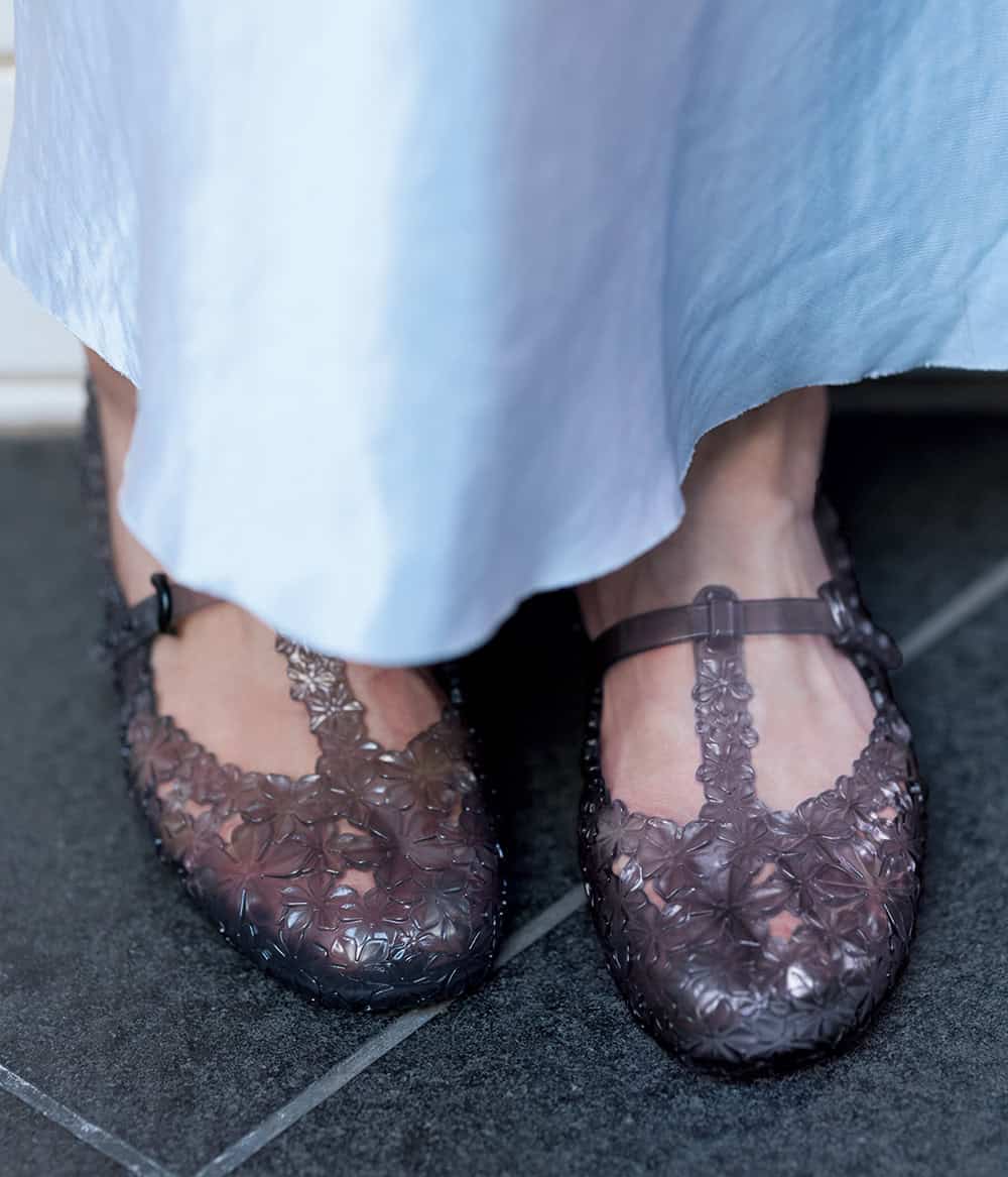 シューズ¥16,500(メリッサ × スーザン ファン/H3Oファッションビュロー)トレンチコート¥41,800レースTシャツ¥18,700(ともにプランクプロジェクト 青山店)ワンピース¥34,100(エムティーモデリスト/ロンハーマン)バッグ¥48,400(オソイ/OSOI SHIBUYA)ピアス各¥132,000(マユオカマツ/マユ ショールーム)